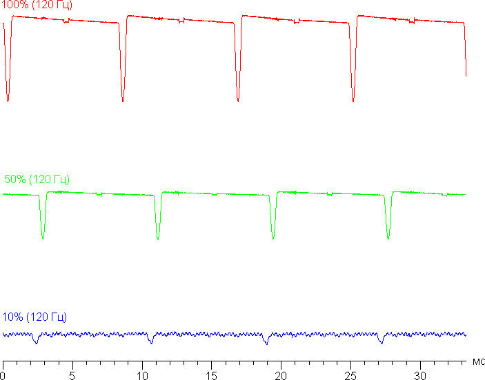 Видно, что на высокой и средней яркости частота модуляции увеличилась в 2 раза (относительно режима с 60 Гц), а на низкой яркости — возросла уже до 3,84 кГц. Видимого мерцания всё так же нет.