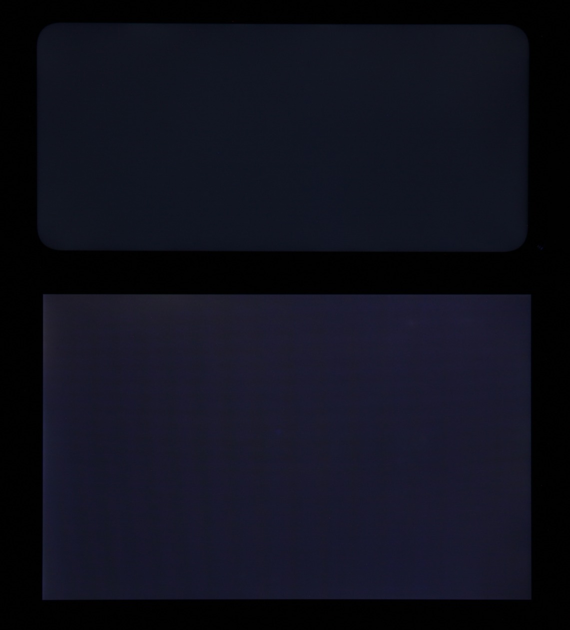 Яркость под углом у экранов уменьшилась (примерно в 5 раз, исходя из разницы в выдержке), но у Honor 9X экран все же немного светлее. Черное поле при отклонении по диагонали высветляется сильно и остается условно нейтрально-серным. Фотографии ниже это демонстрируют (яркость белых участков в перпендикулярном плоскости экранов направлении одинаковая!):