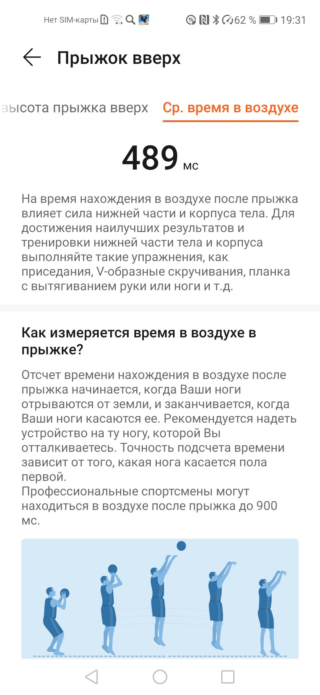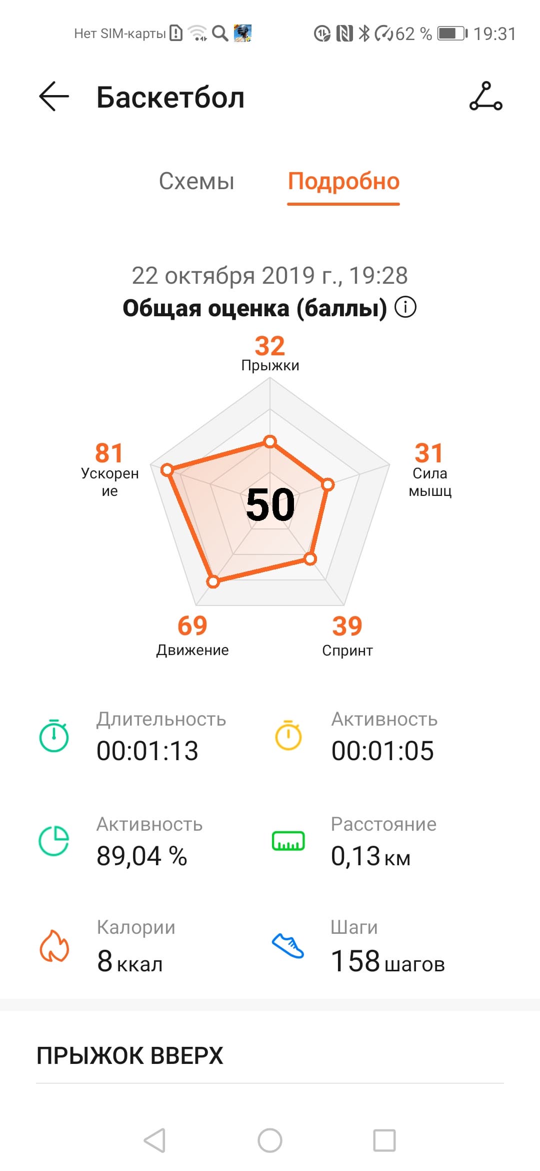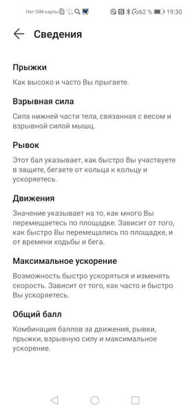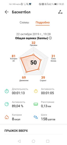 Для баскетбольного режима нет никаких ограничений снизу по длительности: запишет хоть полминуты и расскажет о тренировке выдачей общего балла и оценкой пяти показателей, среди которых сила, ускорение, качество прыжков, рывки и движение (отметим несоблюдение единообразия перевода на разных экранах приложения).