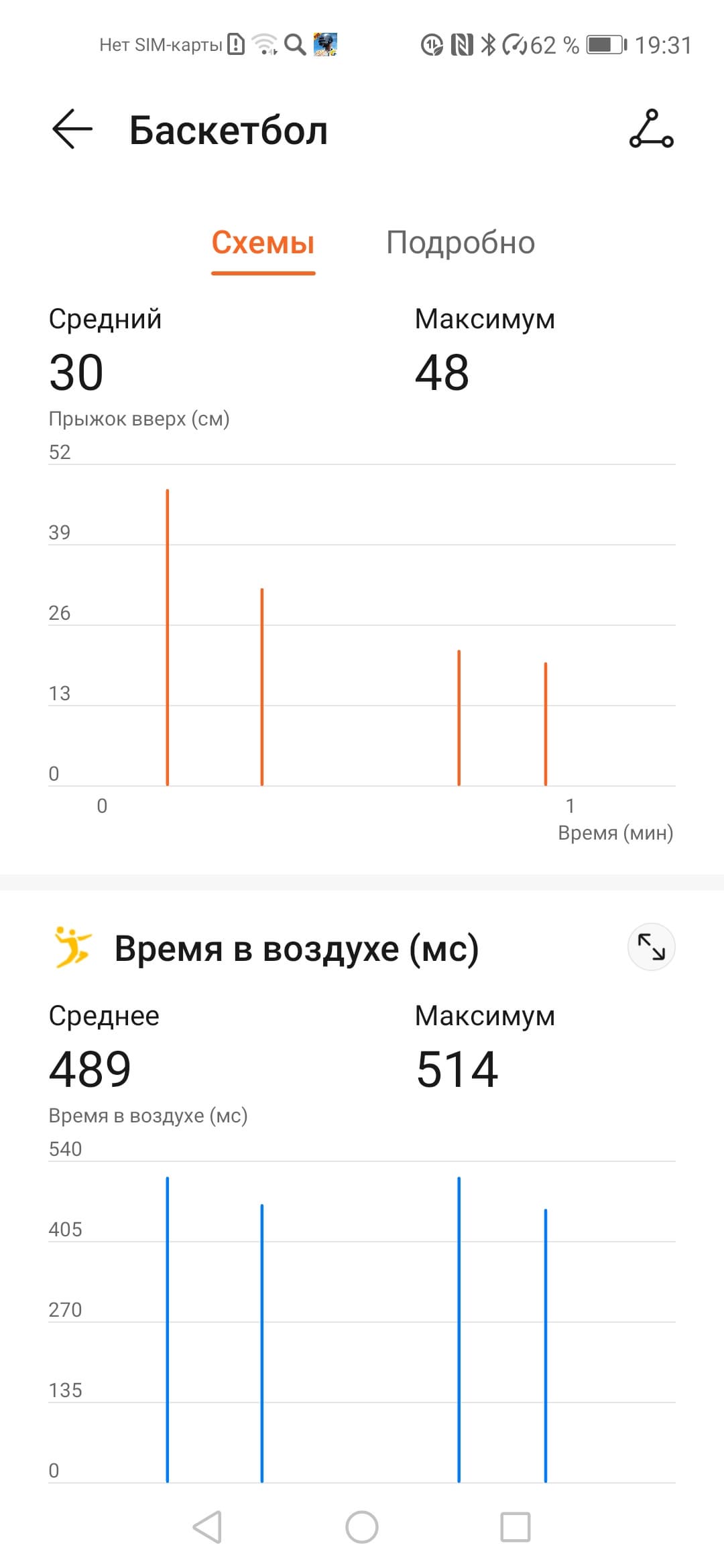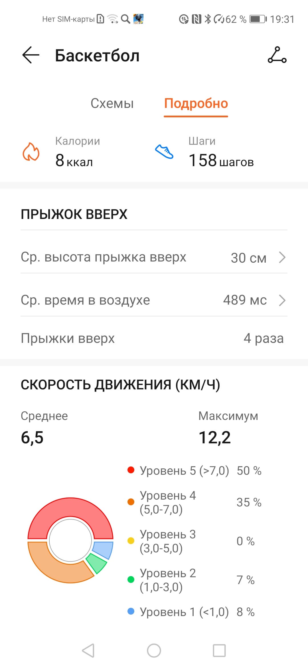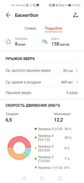 Сводные цифры показаны в виде диаграмм (тут пригодилось бы «листание» тренировок, чтобы увидеть динамику, но пока этого нет), также есть более подробные данные по прыжкам и скорости движения.