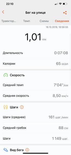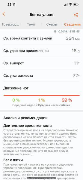 Любопытная деталь: к понятию «тренировка» производитель относится серьезно, поэтому пробежка короче 10 минут и 1 километра за тренировку не считается, а следовательно, и детальная статистика по ней не сохраняется. Но браслет и не ориентирован на тех, кто просто вышел пробежаться на пять минут для очистки совести. В том-то и дело, что он предназначен для мотивированных людей, которые пусть даже и не являются спортсменами, но хотят бегать регулярно, часто, долго и стремятся улучшить не только внешние показатели — скорость, расстояние, время, — но и технику бега. И для этого в приложении есть вся необходимая информация, а также весьма ценные текстовые рекомендации. Разве что не хватает анализа собственно данных: например, удар при приземлении 18 g — это много или мало? А средний угол захлеста 72 градуса — криминал или сойдет?