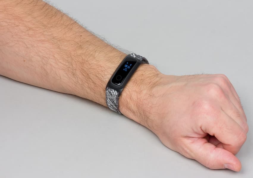 Что касается ремешка, то он, во-первых, довольно эффектный внешне — цвет неоднородный и потому интересный, а во-вторых, его можно идеально подстроить под свою руку. Это особенно важно именно во время тренировок, чтобы браслет не давил, но и не болтался на запястье.