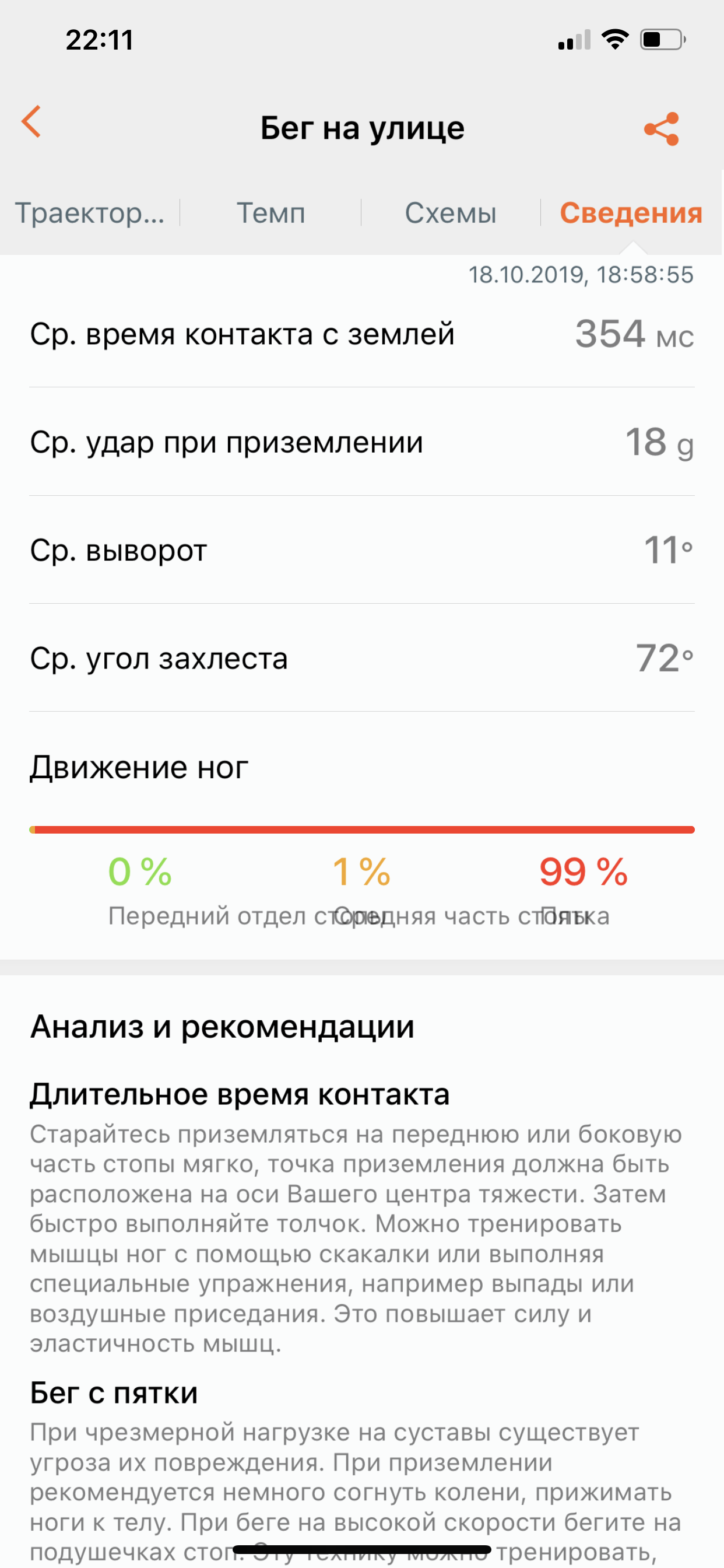 При подключении к смартфону устройство может строить ваш трек, но главное — оно детально анализирует вашу технику: каденцию (количество шагов в минуту), время контакта с землей, удар при приземлении, средний угол захлеста, средний выворот...