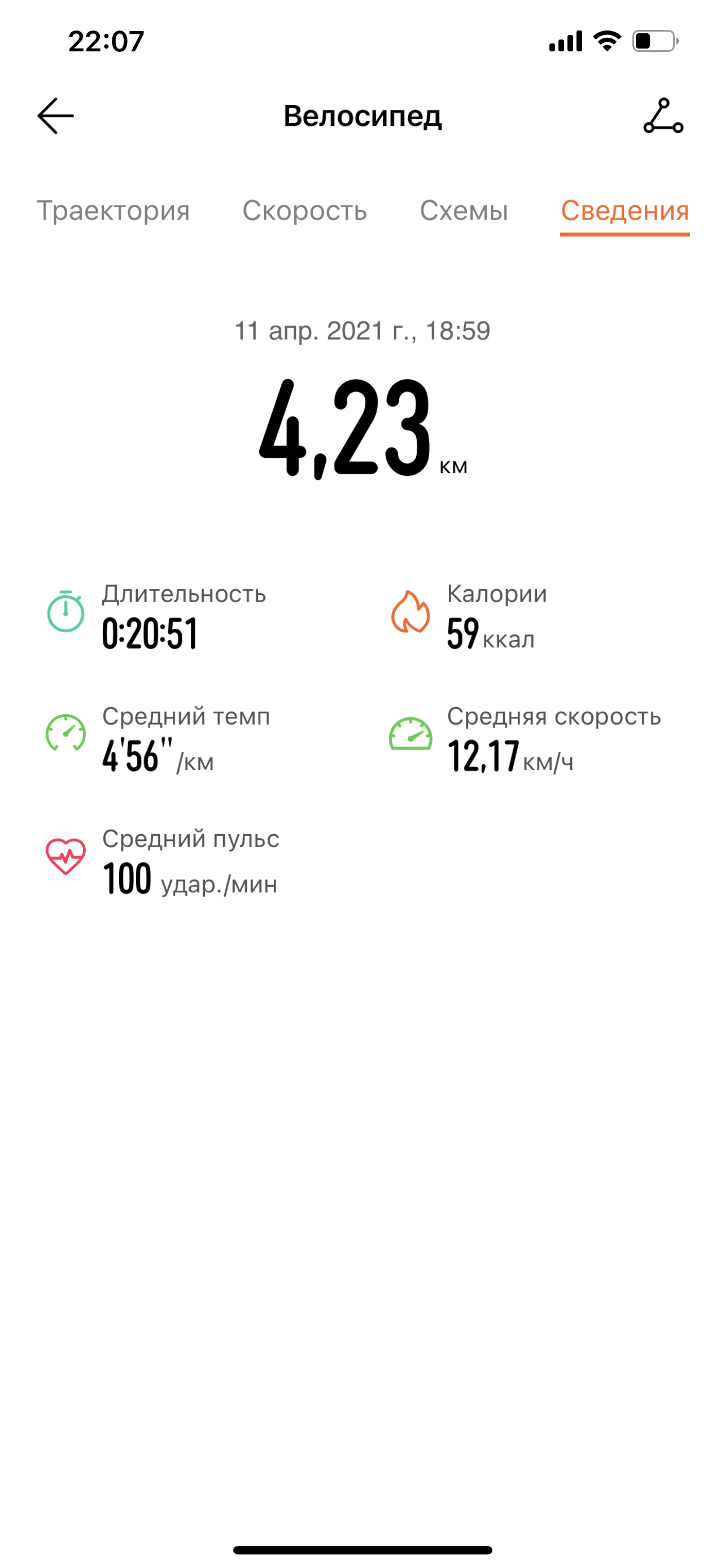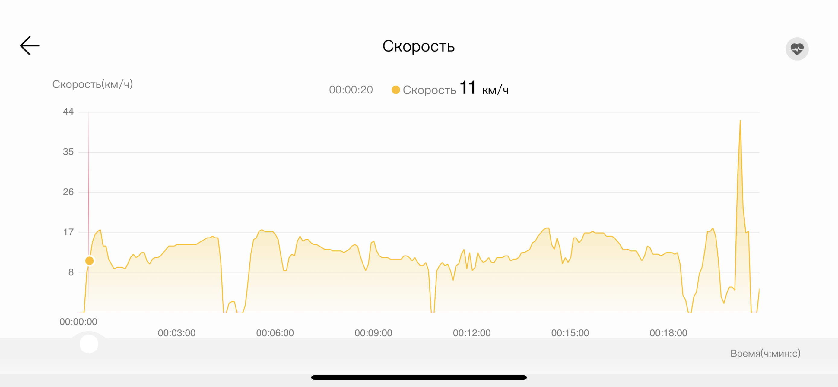 Это сведения по скорости велотренировки. В основном все корректно и точно, но почему-то в самом конце пути браслет решил, что автор внезапно разогнался до 42 км/ч. Это, мягко говоря, маловероятно. Опять сбой в передаче GPS-данных со смартфона? Если смотреть на мир оптимистично, то можно предположить, что производитель исправит это в будущих версиях прошивки.