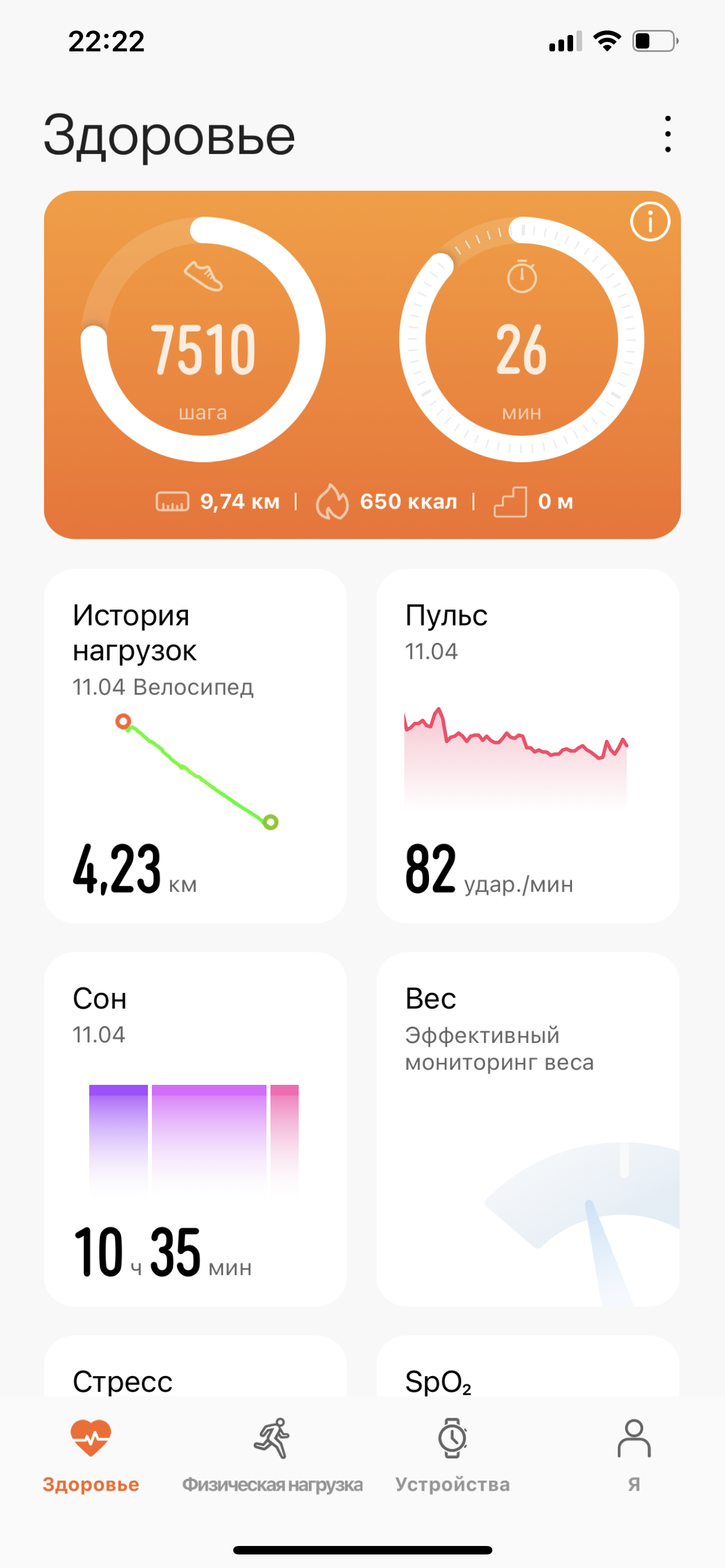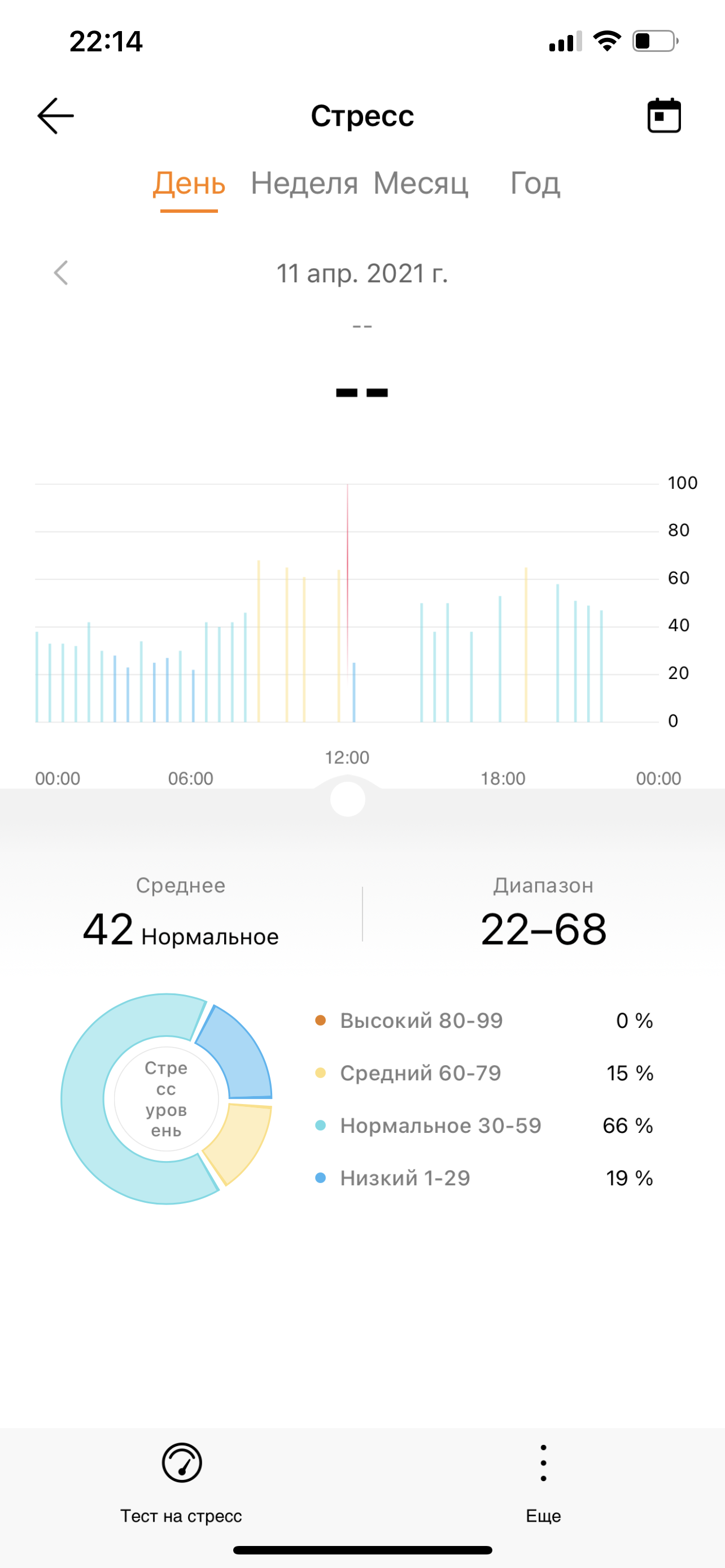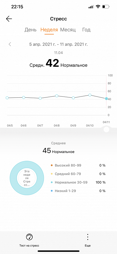 Еще Honor Band 6 умеет отслеживать стресс. Понятно, что все это делается, прежде всего, на основе данных по пульсу. Но мы проверили — да, результат вполне соответствует истине. Те моменты, когда были какие-то ответственные и волнительные события, устройство отмечает оранжевыми полосами как средний уровень стресса. Впрочем, нам ни разу не удалось достигнуть высокого уровня (несмотря на поездку в другой город на самолете, два выступления на конференциях, пару вынужденных пробежек и т. п.). В общем, тут устройство как раз куда менее строгое, чем в отношении сна.