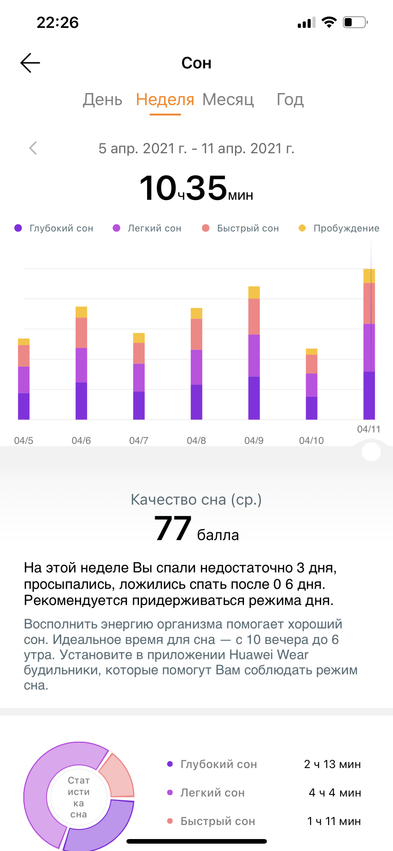 Разумеется, устройство и приложение также критикуют вас за недостаточное количество сна. Но если вы, напротив, проспите слишком много, то тоже прочтете настойчивые советы («Это больше рекомендуемого количества»).
