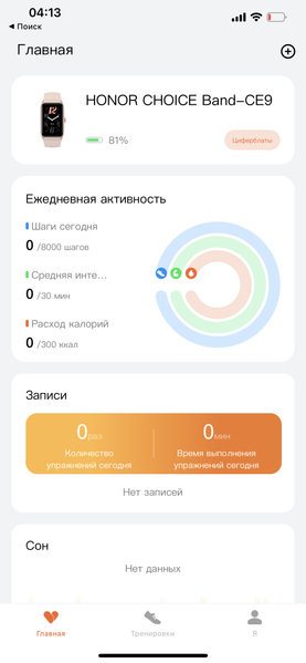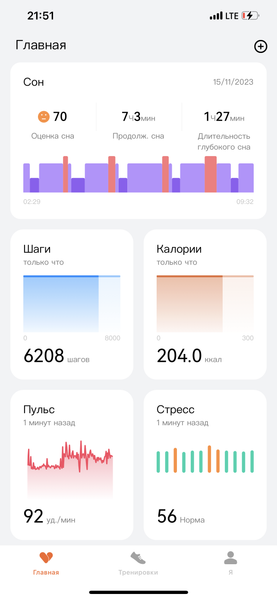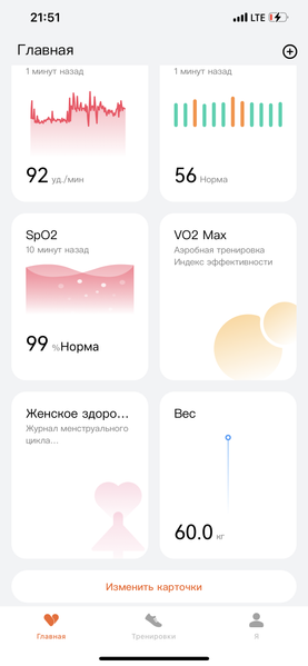 Её функциональность проста и понятна. Логика интерфейса — такая же, как у многих аналогичных решений. Главный экран — сводная информация обо всех физических активностях и параметрах здоровья, представленная в виде карточек. Здесь же можно посмотреть, сколько заряда осталось у батареи браслета.