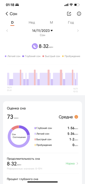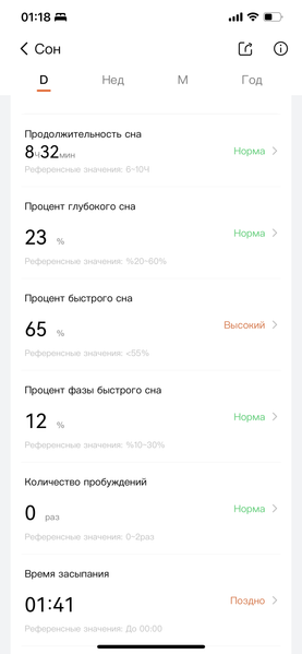 Что касается анализа сна, здесь ситуация чуть похуже: браслет не распознал кратковременные пробуждения. Но, возможно, здесь под пробуждением понимается не просто «открыл глаза и что-то сказал», а, как минимум, «встал с кровати». Тогда вопросов нет. В любом случае, время засыпания и пробуждения отмечено было верно.