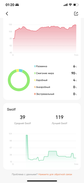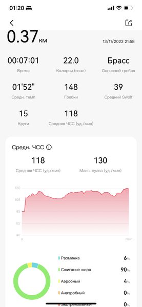 Из тренировок мы попробовали плавание — благо, водонепроницаемость браслета дает такую возможность. И здесь результаты были неплохими — устройство умеет считать Swolf, распознаёт гребки, круги и стиль. Вот только если вы плаваете не одним стилем, а чередуете — например, в одну сторону плывете брассом, в другую — на спине, то браслет определит лишь один — тот, который вы использовали больше.