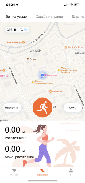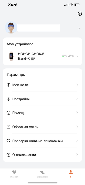 Другие разделы — «Тренировки» (через него можно запустить несколько основных тренировок, чтобы задействовался GPS смартфона) и «Я» (настройки устройства). Настройки, заметим, весьма скудные, сколь-нибудь часто забираться в них смысла нет. Но, например, там же есть проверка наличия обновлений, и вот это уже полезно.