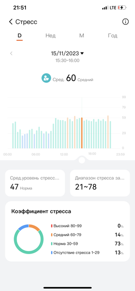 Последнее нам было особенно интересно протестировать, поскольку нередко умные устройства попадают здесь впросак — всё же это не такой точный параметр, и правильно определить его можно, только сопоставив несколько показателей. Но Honor Choice Band справился с задачей достойно. На графике ниже можно увидеть раскладку по часам за выбранный день. И действительно, именно в эти часы, которые отмечены оранжевым, поволноваться пришлось чуть больше (где-то надо было не опоздать, где-то была важная встреча и так далее).