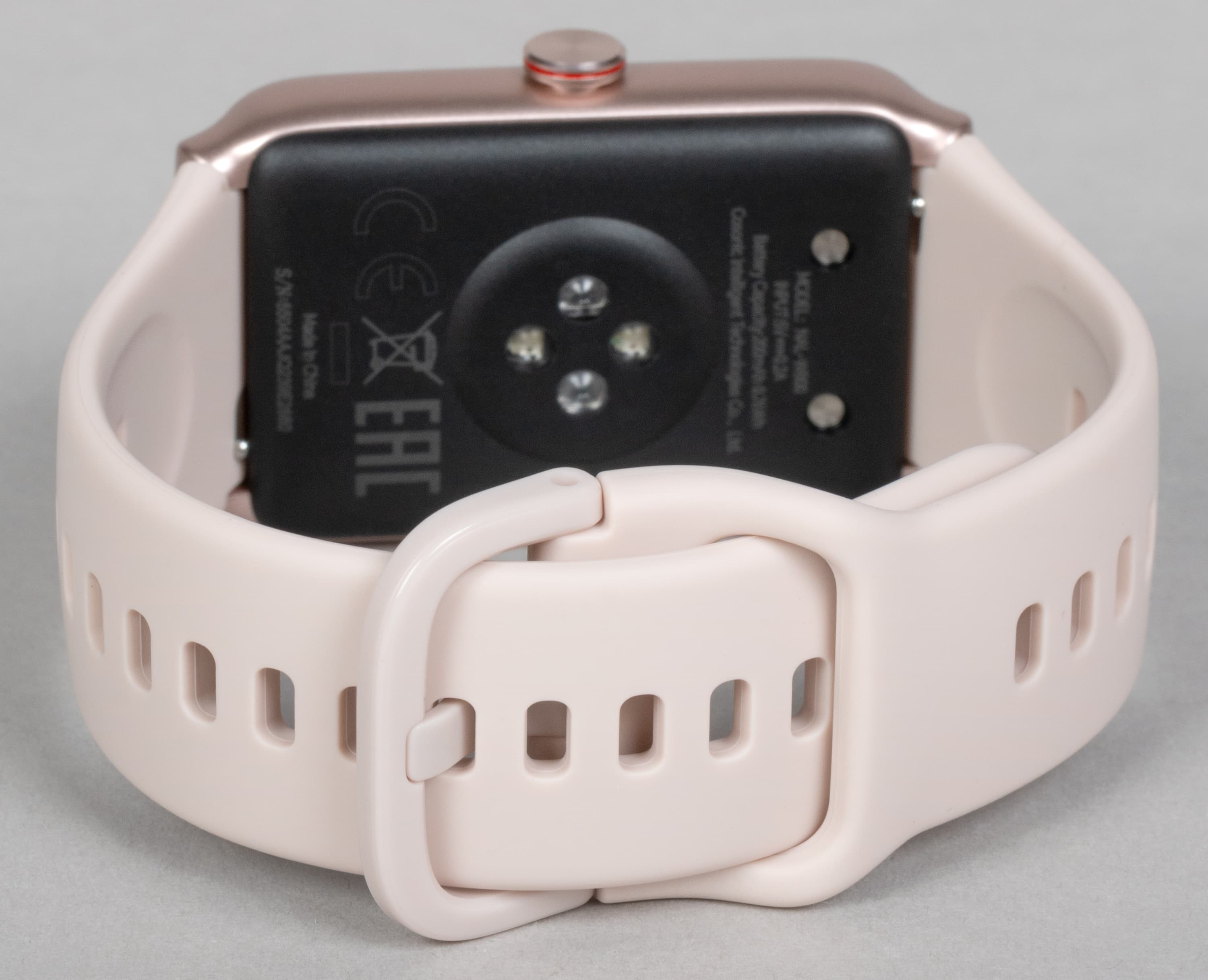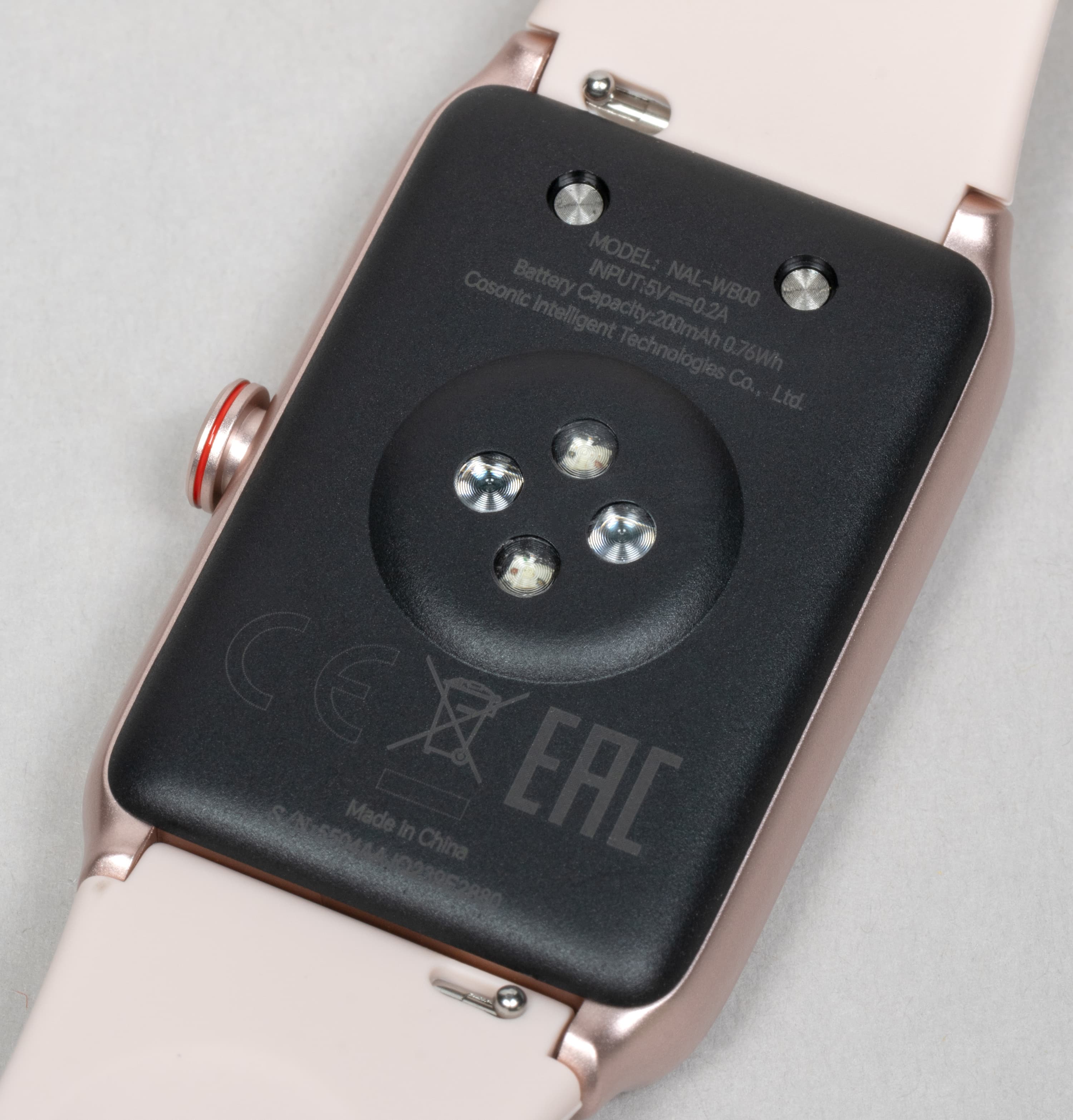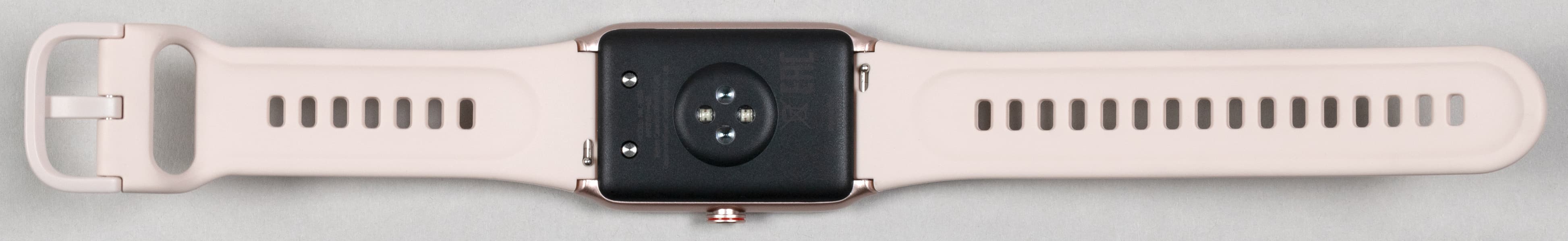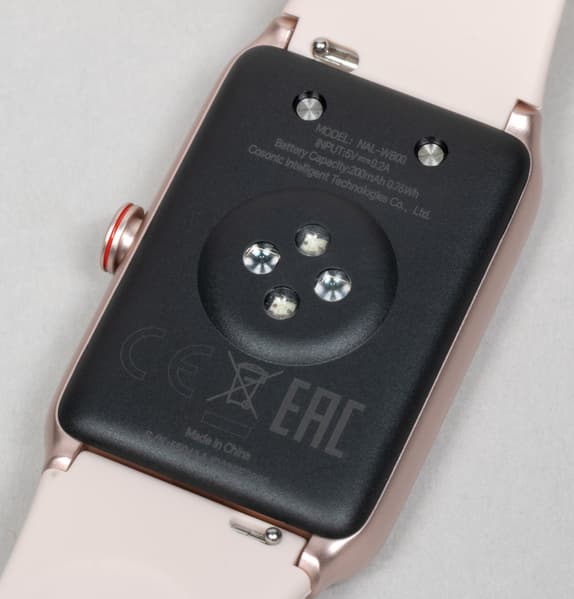 Тыльная поверхность корпуса браслета, прилегающая к руке, пластиковая. Помимо чуть выступающий круглой площадки с оптическими сенсорами для измерения пульса и кислорода в крови здесь видны два контакта для подсоединения зарядного устройства.