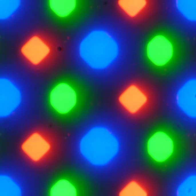 В этом экране используется OLED-матрица — активная матрица на органических светодиодах. Полноцветное изображение создается с помощью субпикселей трех цветов — красного (R), зеленого (G) и синего (B) в равном количестве, что подтверждается фрагментом микрофотографии: