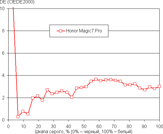 Напомним, что в случае OLED-экранов яркость фрагментов изображения динамично меняется в соответствии с характером выводимого изображения — чуть уменьшается для светлых в целом изображений. В итоге полученная зависимость яркости от оттенка (гамма-кривая), скорее всего, не соответствует гамма-кривой статичного изображения, так как измерения проводились при последовательном выводе оттенков серого почти на весь экран.