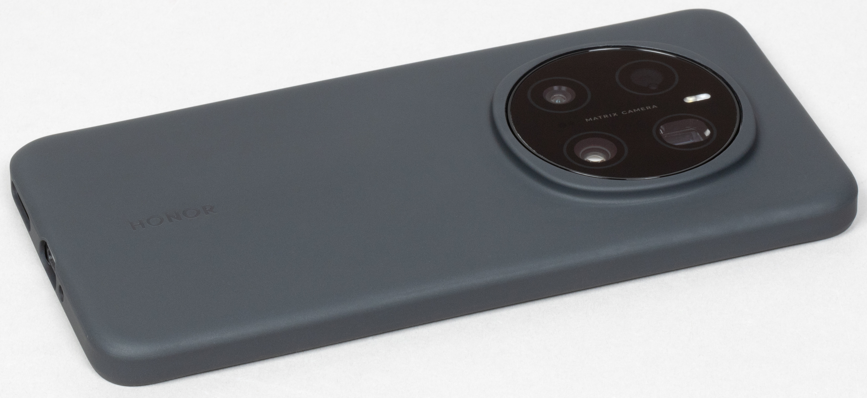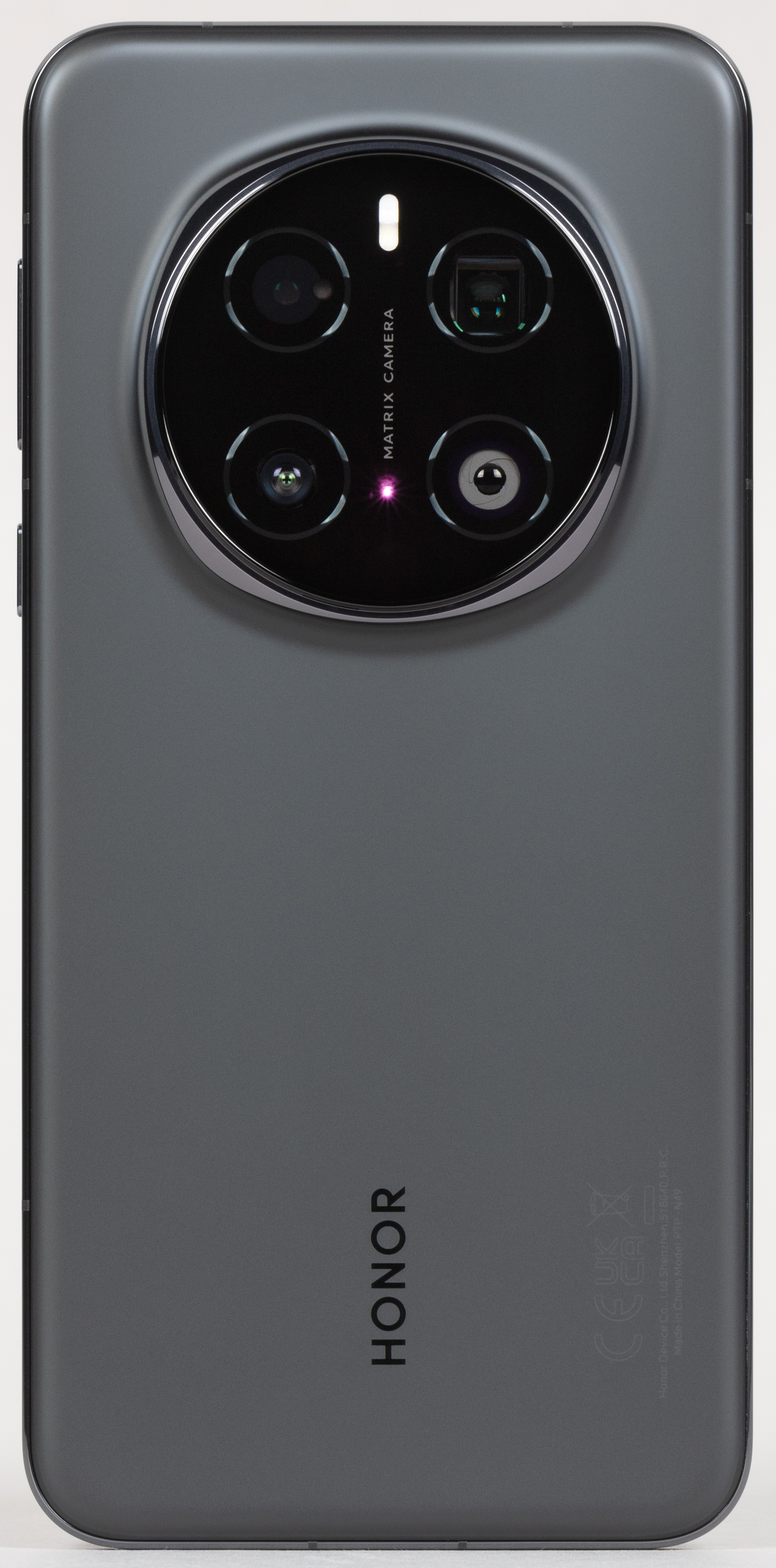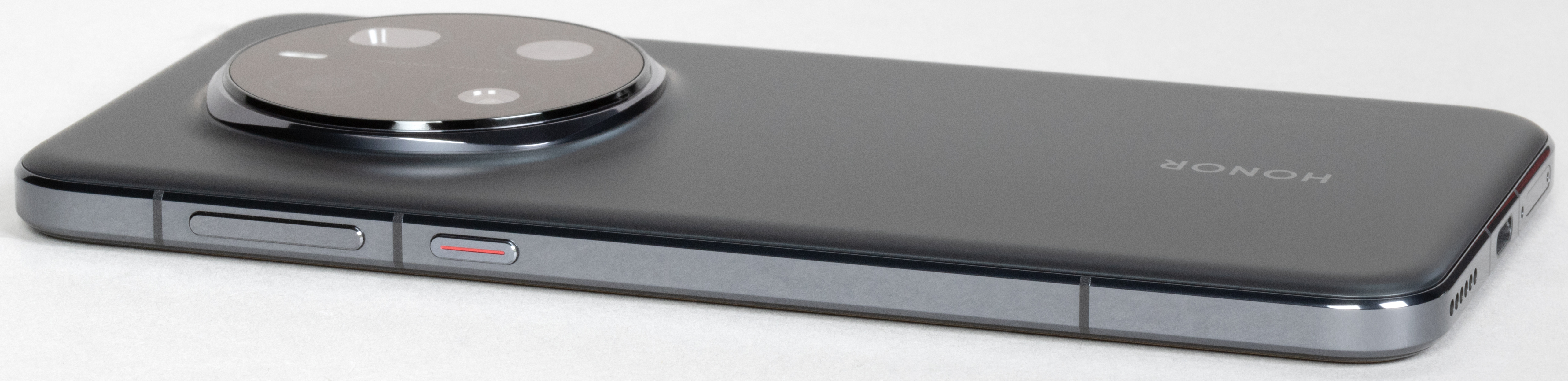 Единственное украшение — блестящий хромированный ободок вокруг выступающего круглого блока камер. Этот элемент бросается в глаза и определяет визуальное различие с предыдущей моделью, которая отличается лишь формой этого ободка: у Honor Magic 6 Pro был восьмиугольник. К слову, новинка и по размеру корпуса немного шире своего предшественника (77,1 мм против 75,8 мм).