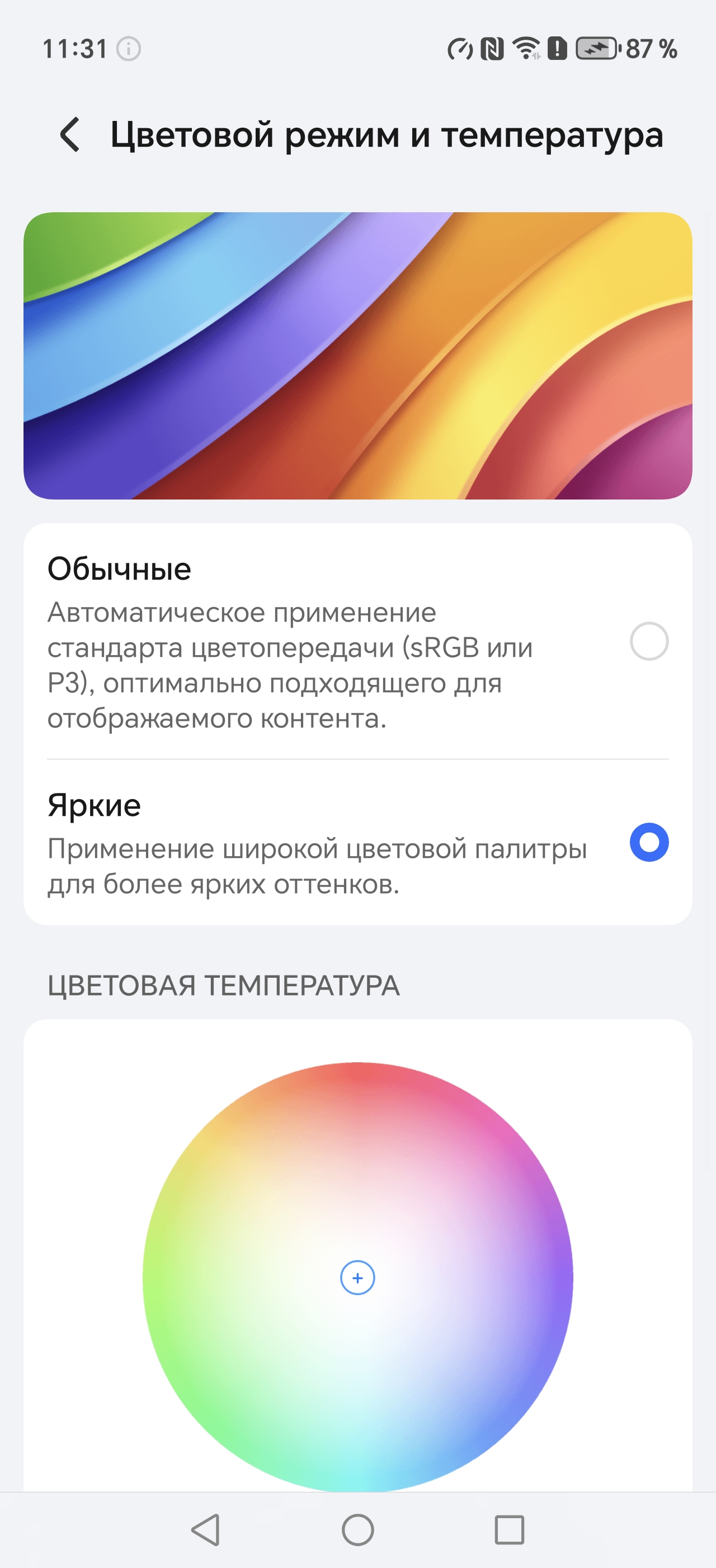 Фотография выше получена при активном профиле Обычные [цвета] в настройках экрана, всего их два: