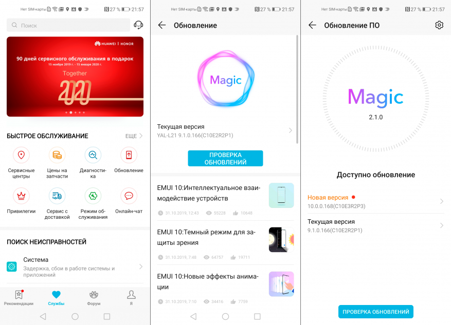 В первую очередь Honor распространяет обновление через пользователей фирменного приложения HiCare. Если системная утилита, доступная через меню «Настройки», показывает, что установленная Magic UI 2.1 — самая свежая из доступных, попытайте счастья в HiCare, нажав «Обновление». В первую очередь компания планирует обеспечить обновлением модели, Honor 10, Honor V10, Honor 8X, Honor 9X, Honor 20s и Honor 20 Lite.