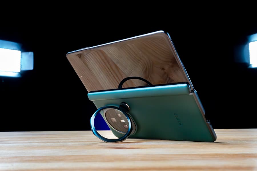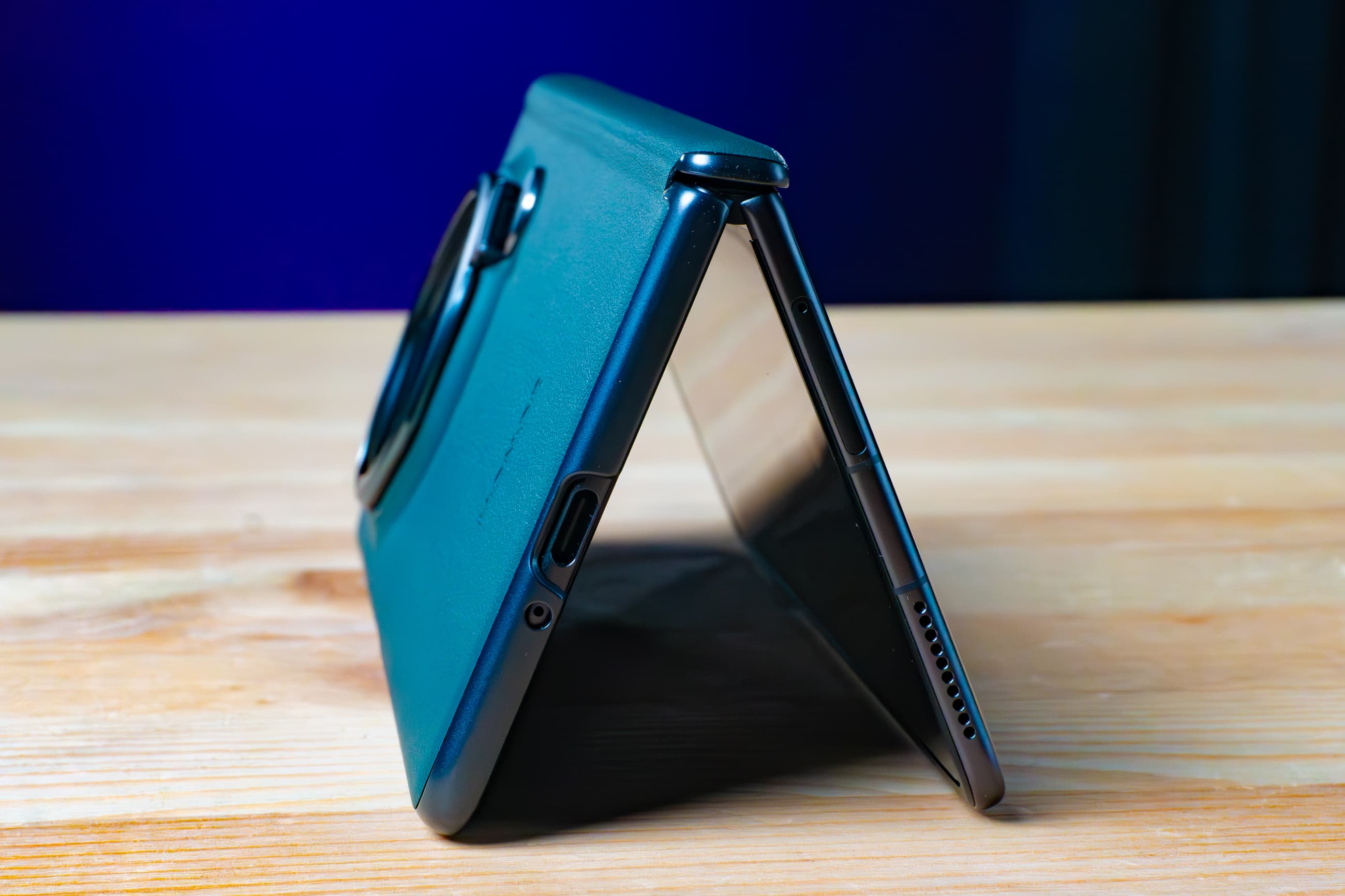Но это касается только сложенного состояния. В разложенном телефон — точнее, уже планшет — лежит неровно. Проблему использования на столе решает комплектный чехол. Отверстие для блока камер у него обрамляет кольцо-подставка, позволяющее зафиксировать смартфон (в любом из состояний) стоймя в довольно широком диапазоне углов наклона. Но всему, конечно, есть предел.