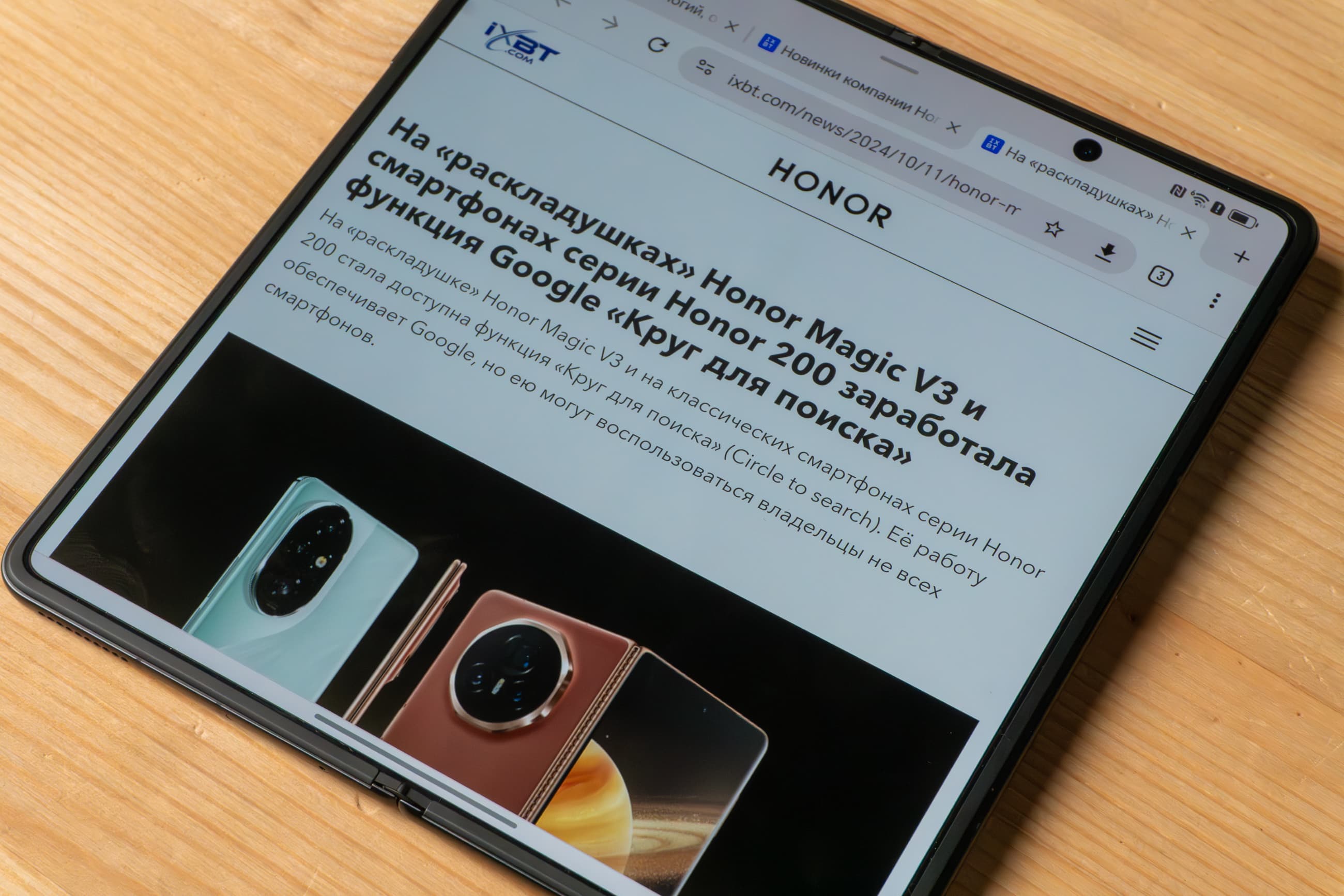 Оконный режим в Magic UI есть уже давно, причем работает и на обычных смартфонах, а в Honor Magic V3 он в самом деле пригождается. В обновлении этого года появились функции, испольщующие искусственный интеллект, о них расскажем в обзоре. Часть из них — разработка Google, например, «Волшебный ластик» (позволяет удалять лишние объекты с фото) и «Круг для поиска» (можно обвести что угодно на экране и отправить это как поисковый запрос).
