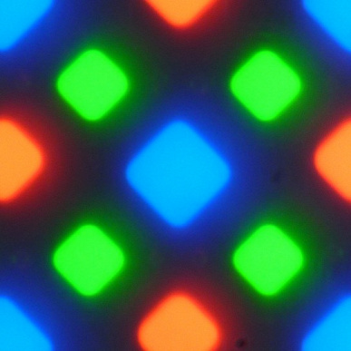 На фрагменте выше можно насчитать 4 зеленых субпикселя, 2 красных (4 половинки) и 2 синих (1 целый и 4 четвертушки), при этом, повторяя эти фрагменты, можно выложить весь экран без разрывов и перехлеста. Для таких матриц компания Samsung ввела наименование PenTile RGBG. Разрешение экрана производитель считает по зеленым субпикселям, по двум другим оно будет ниже. Присутствуют некоторая неровность контрастных границ и другие артефакты, но из-за высокого разрешения они лишь минимально сказываются на качестве изображения.