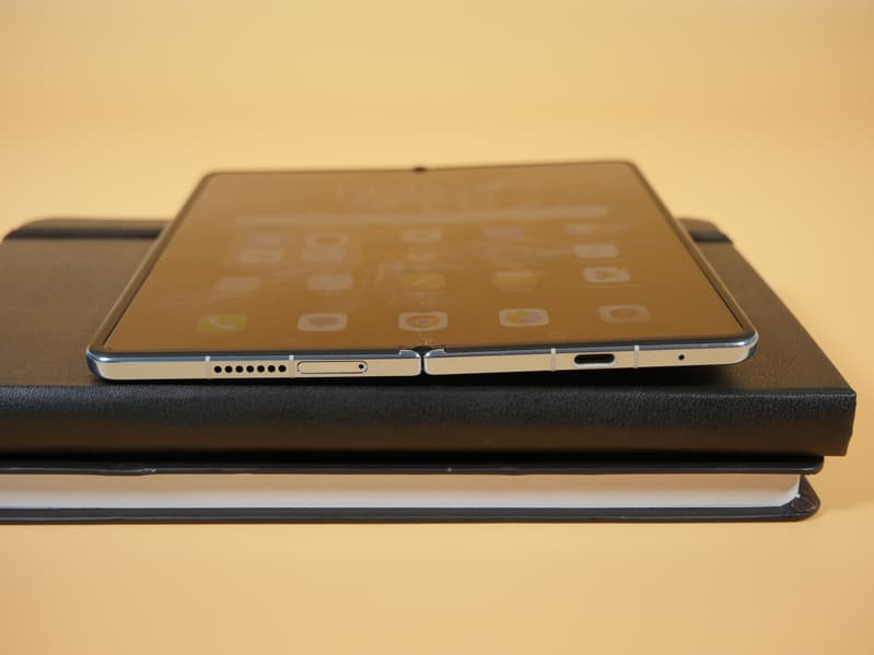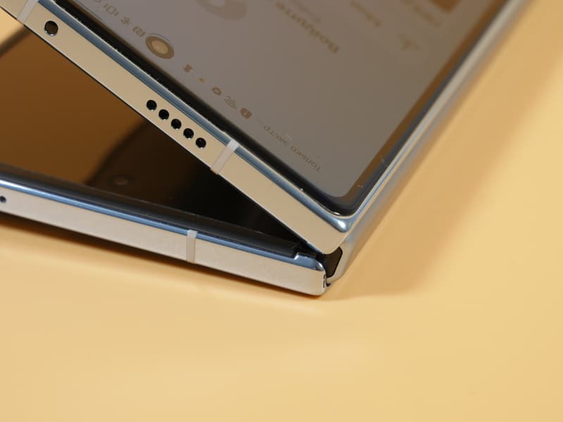 В разложенном состоянии половинки не имеют жесткой фиксации, они продолжают болтаться, если взять за одну сторону и покачать устройство. Вроде бы ничего страшного, но как-то непривычно. Корпус у аналога Samsung четко фиксируется, превращаясь в единую жесткую площадку, и ее необходимо с усилием разломить, чтобы начать схлопывание. Здесь такого нет. Нет четкой фиксации половинок и на промежуточных углах раскрытия, так что в мини-ноутбук с зафиксированными на 90 градусов половинками Honor Magic Vs превратить трудно.