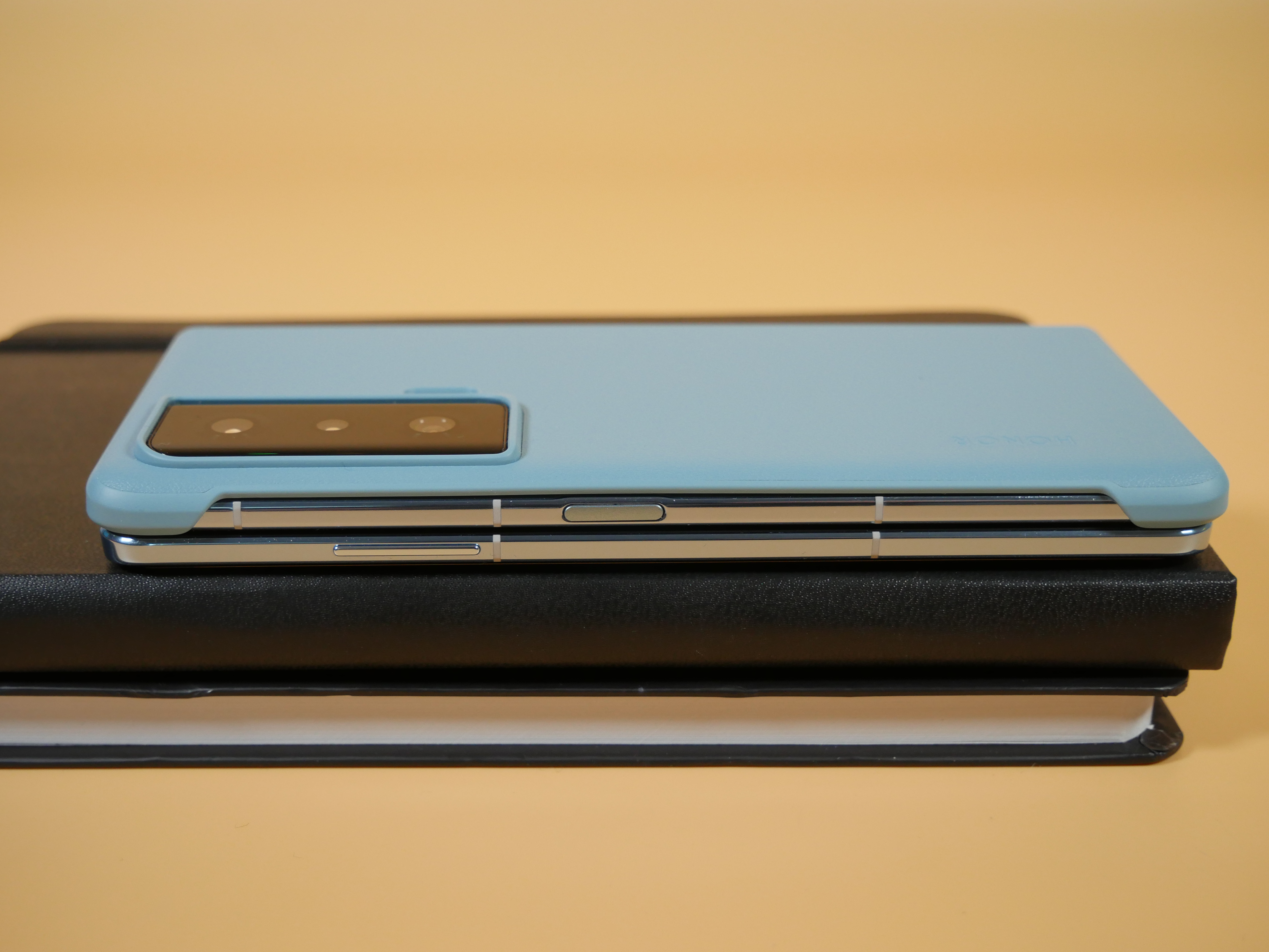 Есть и второй дисплей, на всю внешнюю половинку. Он работает в сложенном состоянии, превращая Honor Magic Vs в самый обыкновенный смартфон, только толстый и тяжелый. Внешний дисплей — это 6,45-дюймовый OLED с разрешением 2560×1080 пикселей и соотношением сторон 21:9. Тут уже поддерживается частота обновления 120 Гц. Габариты в сложенном состоянии такие: 160×73×12,9 мм. Больше обычного смартфона, но среди «раскладушек» это, пожалуй, одна из самых изящных. Масса — 260 г.