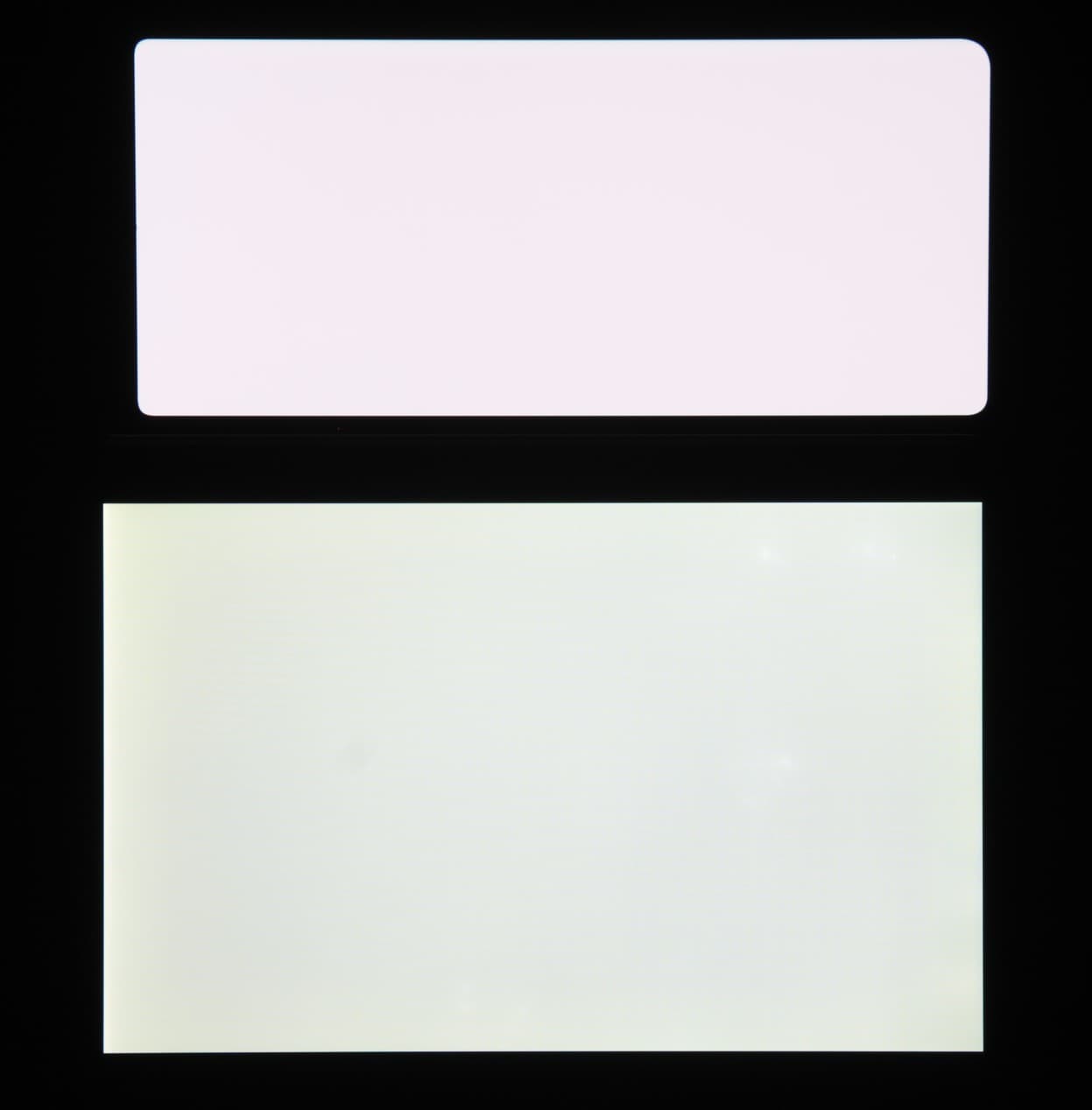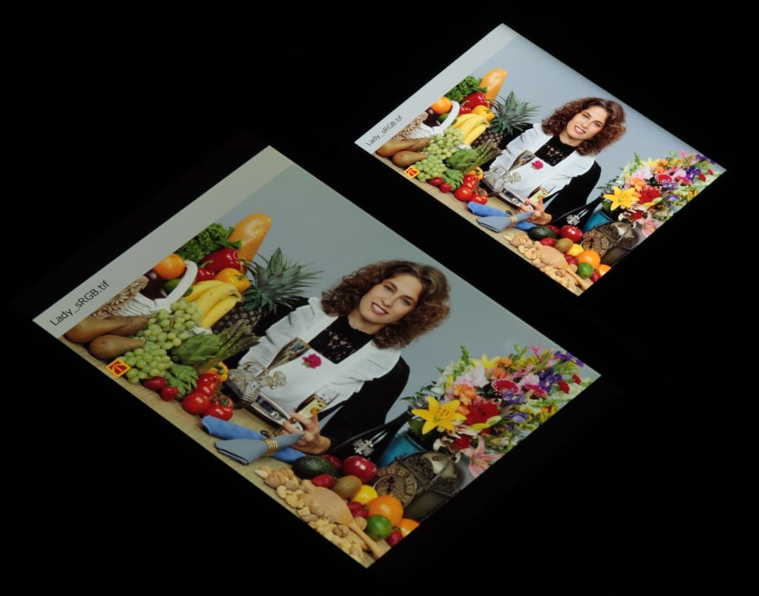 Экраны характеризуются великолепными углами обзора. Правда, белый цвет при отклонении на большие углы приобретает легкий сине-зеленый оттенок, но черный цвет остается просто черным под любыми углами. Он настолько черный, что параметр контрастности в данном случае неприменим. Для сравнения приведем фотографии, на которых на экраны Honor Magic Vs (профиль Яркие, который установлен по умолчанию) и второго участника сравнения выведены одинаковые изображения, при этом яркость экранов по белому полю изначально установлена примерно на 200 кд/м², а цветовой баланс на фотоаппарате принудительно переключен на 6500 К.