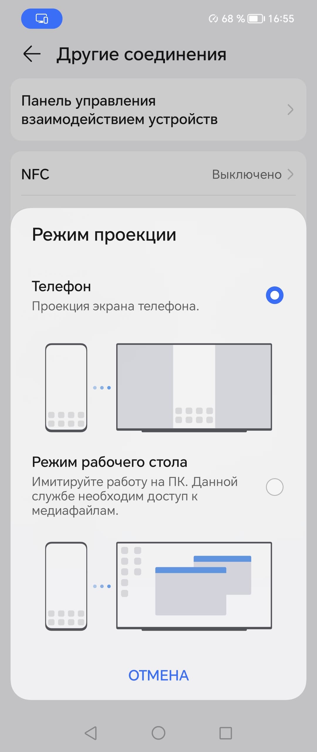 Во втором случае при портретной ориентации экрана смартфона картинка на экране ТВ выводится вписанной по высоте и с широкими черными полями по бокам, а при ландшафтной — вписанной по ширине с узкими черными полями сверху и снизу. Вывода точка в точку в обоих вариантах нет.