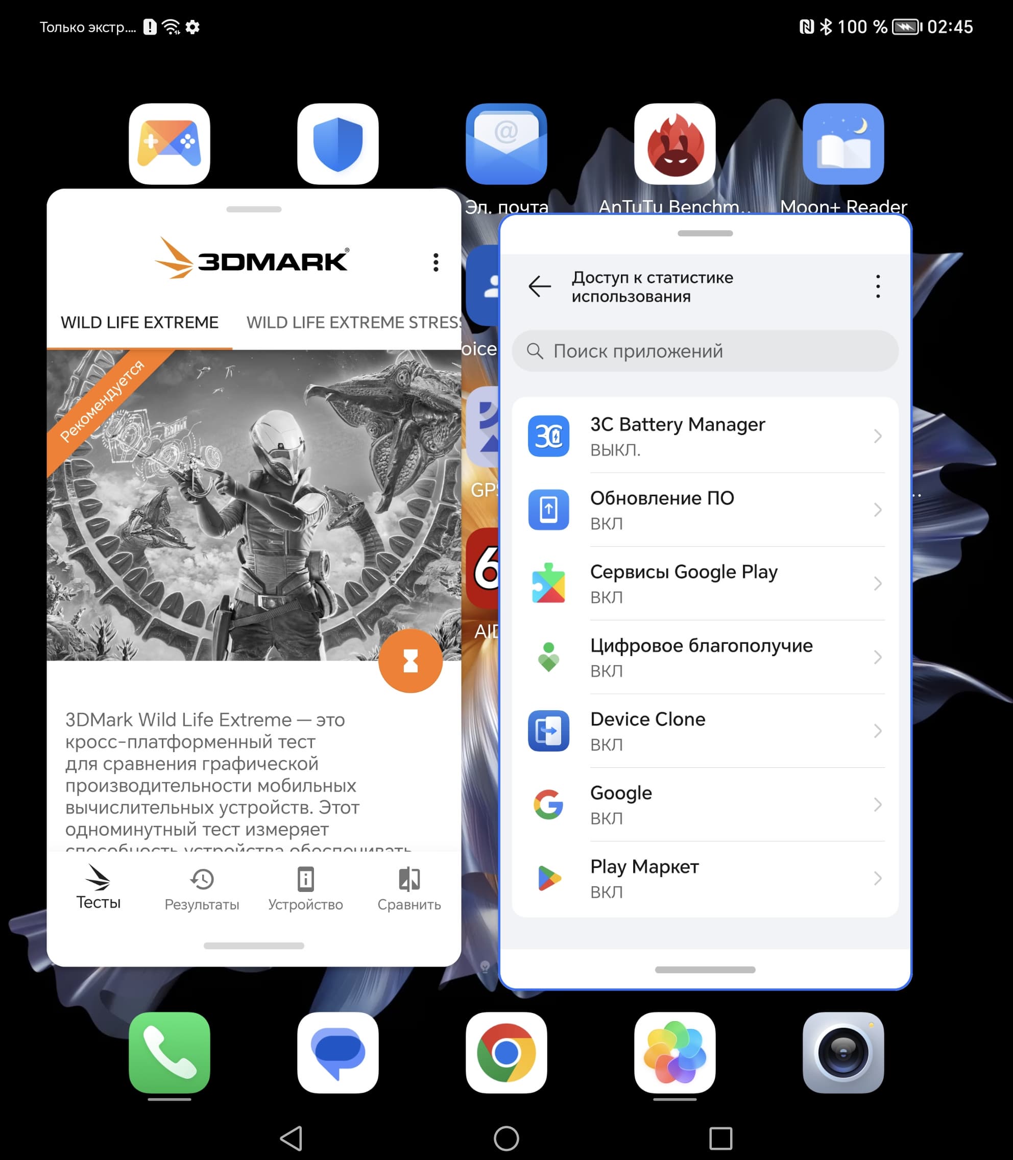 В качестве программной платформы Honor Magic Vs использует версию ОС Android 13 с собственной оболочкой MagicOS 7.1. Были добавлены некоторые новые экосистемные функции и расширены возможности Ассистента Yoyo, но в целом оболочка практически не задействует преимущества раскладывающегося экрана. Просто информации больше влезает, и всё. У большинства «раскладушек» аналогичная ситуация; доработанный под особенности внутреннего экрана софт пока имеется разве что у Samsung. Однако стандартную возможность работы в двух окнах никто не отменял и здесь. На большом экране делать это еще удобнее.
