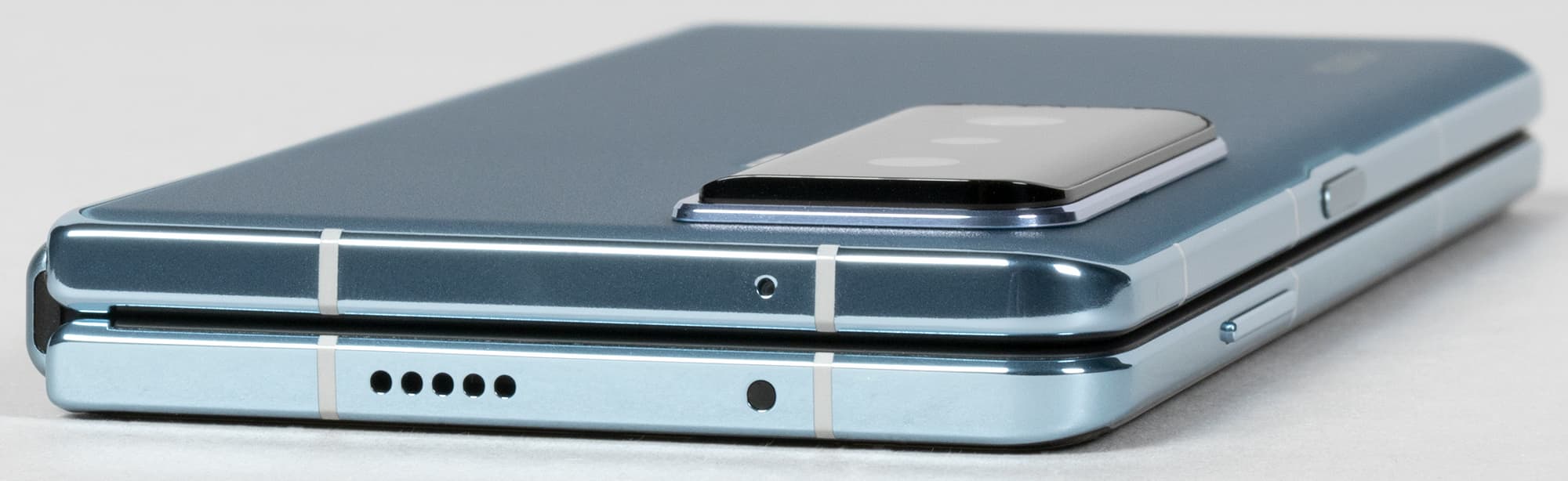 Кнопки грамотно установлены на обоих половинках, так что при раскладывании оказываются не на одной, а на разных сторонах, как и должно быть. Ведь хват «планшета» — двуручный, и кнопки удобно иметь под пальцами с двух сторон, а не с одной. Сканер отпечатков пальцев удачно врезан в боковую клавишу, где ему самое место, особенно в таком тяжелом и толстом устройстве. Разблокировать прикосновением к нижней части экрана такой аппарат было бы совсем некомфортно.