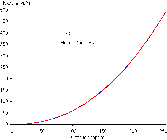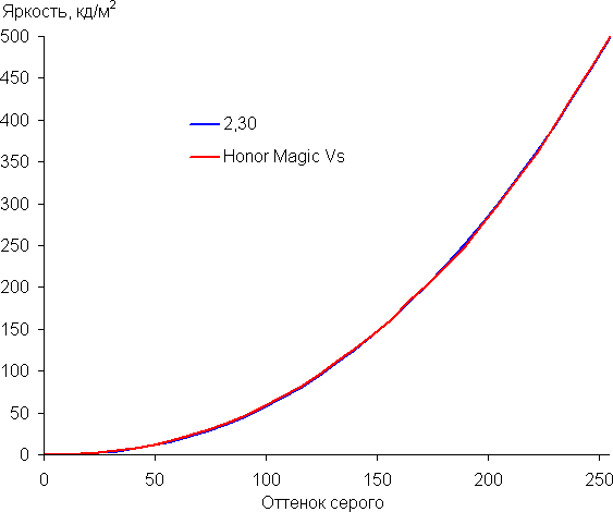 Напомним, что в случае OLED-экранов яркость фрагментов изображения динамично меняется в соответствии с характером выводимого изображения — уменьшается для светлых в целом изображений. В итоге полученная зависимость яркости от оттенка (гамма-кривая), скорее всего, немного не соответствует гамма-кривой статичного изображения, так как измерения проводились при последовательном выводе оттенков серого почти на весь экран.
