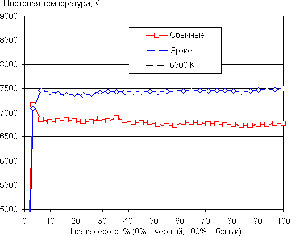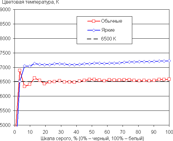 В этом устройстве есть возможность скорректировать цветовой баланс с помощью выбора профиля цветовой температуры или регулировки оттенка на цветовом круге. Даже в случае отсутствия коррекции баланс оттенков на шкале серого в случае профиля Обычные хороший, так как цветовая температура близка к стандартным 6500 К, а отклонение от спектра абсолютно черного тела (ΔE) ниже 10 единиц, что для потребительского устройства считается приемлемым показателем. При этом цветовая температура и ΔE мало изменяются от оттенка к оттенку — это положительно сказывается на визуальной оценке цветового баланса: