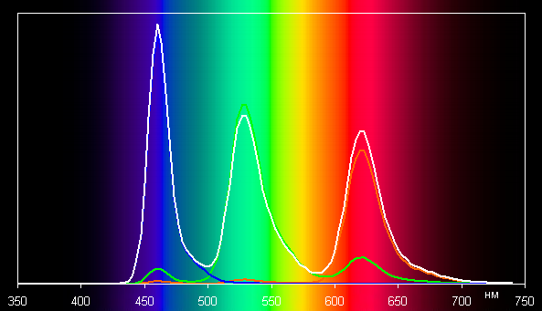 Без коррекции (вариант Яркие) спектры компонент (то есть спектры чистых красного, зеленого и синего цветов) хорошо разделены, но какое-то перекрестное подмешивание есть :