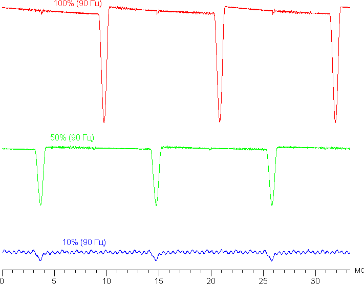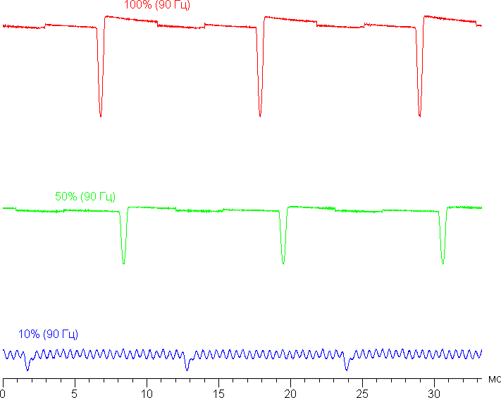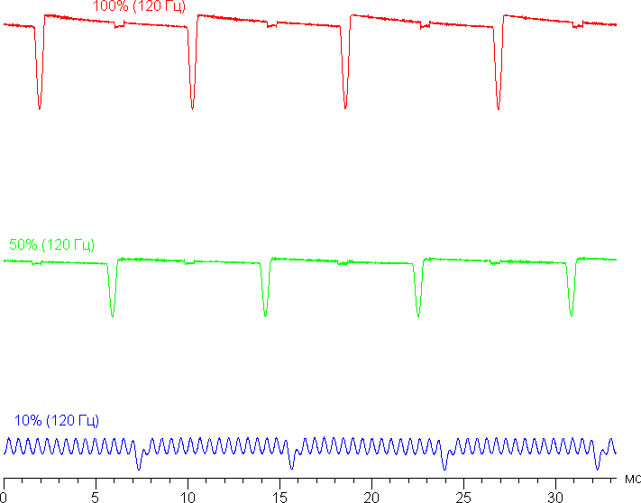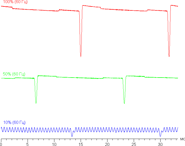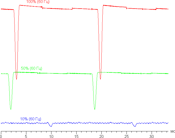 Видно, что скважность модуляции (с частотой 60 Гц) небольшая, в итоге видимого мерцания нет на любом уровне яркости. Отметим, что при сильном понижении яркости появляется дополнительная модуляция с высокой частотой — 1920 Гц.