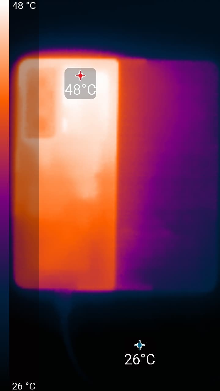 Нагрев больше в верхней части аппарата, что, видимо, соответствует расположению микросхемы SoC. По данным теплокамеры, максимальный нагрев составил 48 градусов (при температуре окружающего воздуха в 24 градуса), это среднее значение для данного теста среди современных смартфонов.