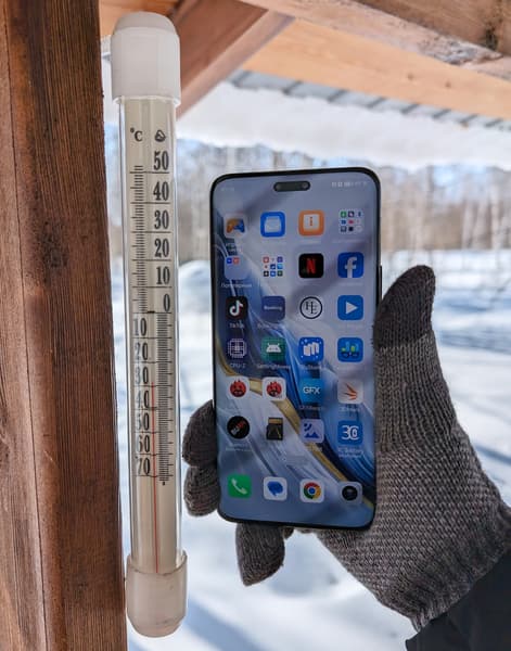Но вернёмся к морозу. Аккумулятор нового типа, как заявляется, гораздо лучше переносит экстремальные условия вроде слишком низкой или высокой температуры. Мы проверили это и в холодной апрельской Якутии, и в обычной морозилке холодильника (московского, но это и не важно). При глубоко минусовой температуре смартфон теряет заряд очень медленно. Например, за ночь в морозилке Honor Magic6 Pro потерял всего лишь 4% заряда, пролежав в инее всю ночь, целых 8 часов. То есть всего полпроцента в час. При активном использовании на сильном морозе смартфоне тоже не разряжается стремительно и не делает попыток выключиться.