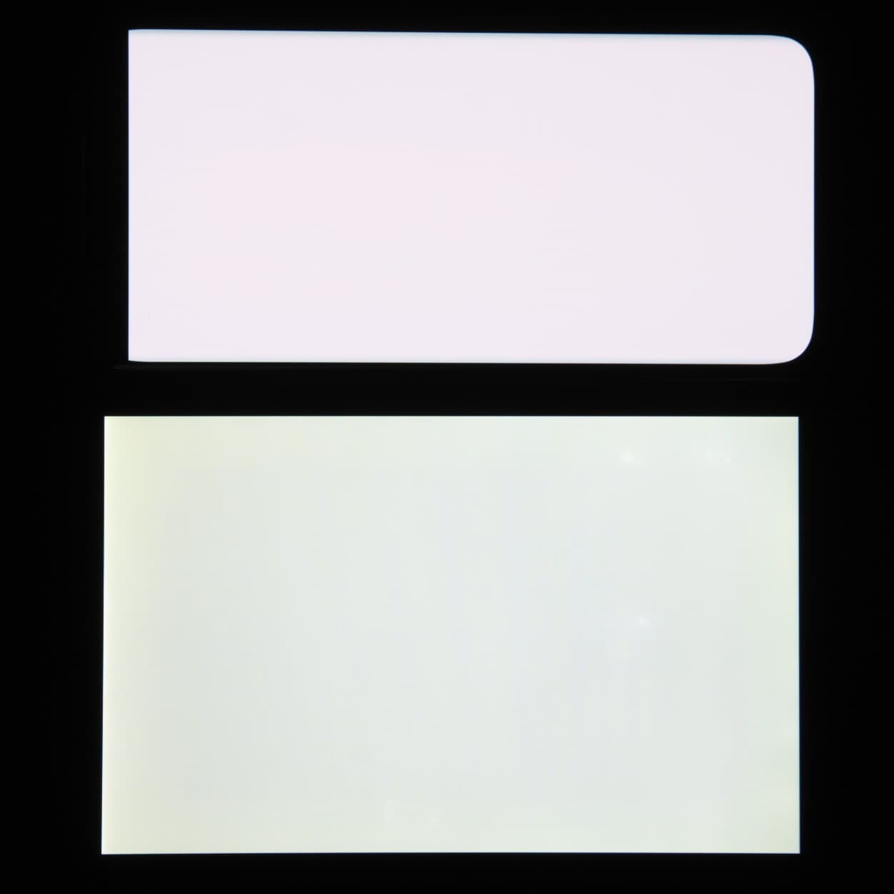 Отметим хорошую равномерность яркости и цветового тона белого поля (за исключением затемнения и изменения оттенка к загнутым краям).