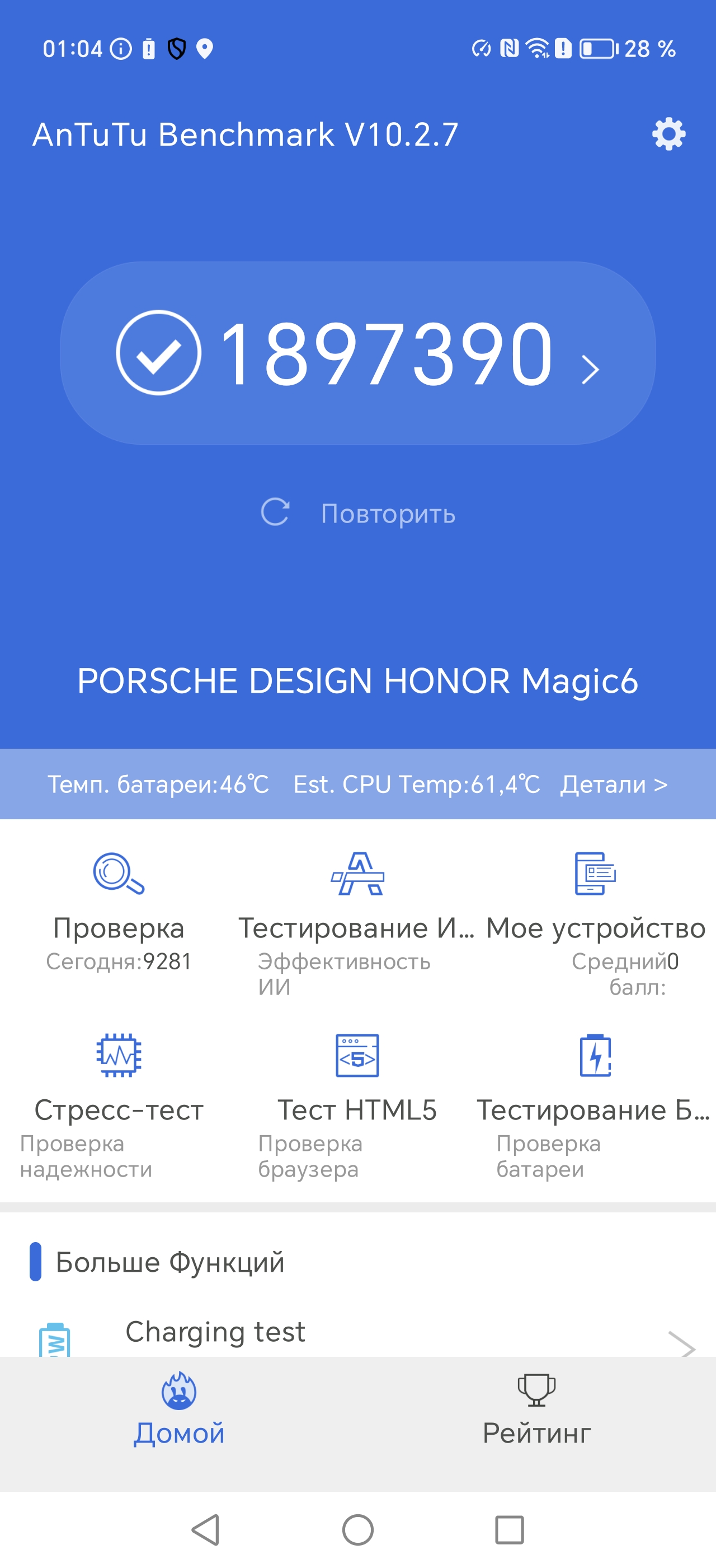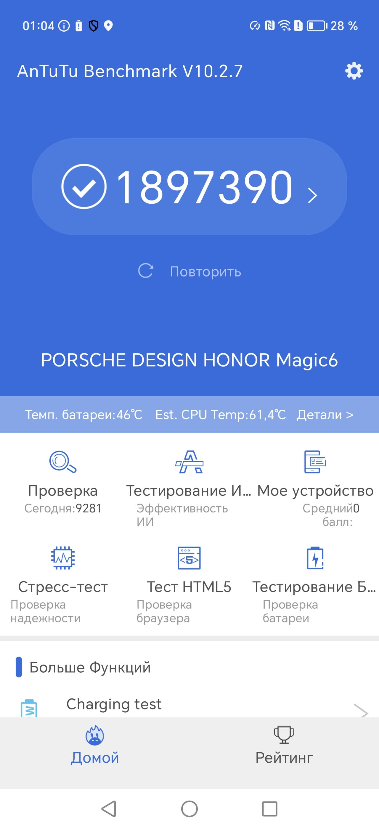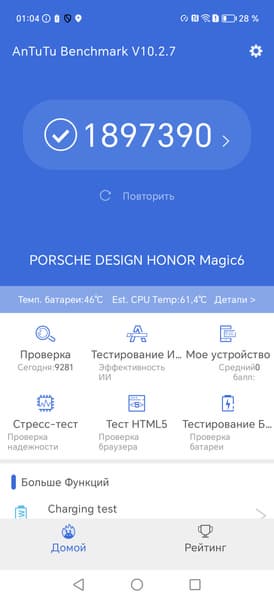Смартфон Honor Magiс6 RSR Porsche Design получил новейшую батарею (Si/C) с повышенным объемом в 5600 мА·ч. Неудивительно, что тестах аппарат демонстрирует максимально высокий, граничащий с рекордным уровень автономности.