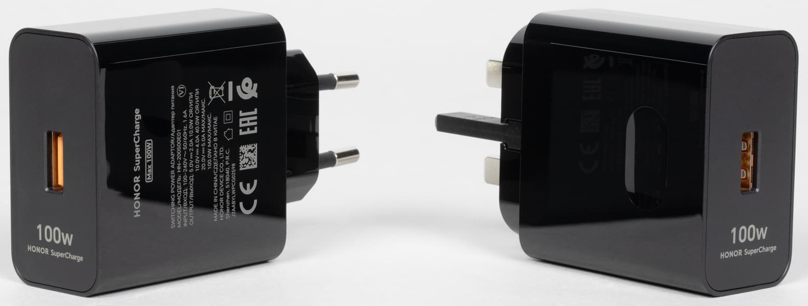 Комплект включает сразу два зарядных устройства мощностью 100 Вт с вилками для разных регионов, а также интерфейсный кабель. Любопытно, что сам смартфон поддерживает максимум 80-ваттную зарядку.