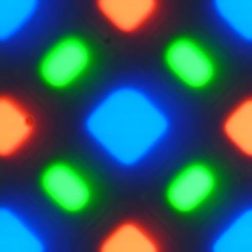 В этом экране используется матрица AMOLED — активная матрица на органических светодиодах. Полноцветное изображение создается с помощью субпикселей трех цветов — красного (R), зеленого (G) и синего (B), но красных и синих субпикселей в два раза меньше, что можно обозначить как RGBG. Это подтверждается фрагментом микрофотографии: