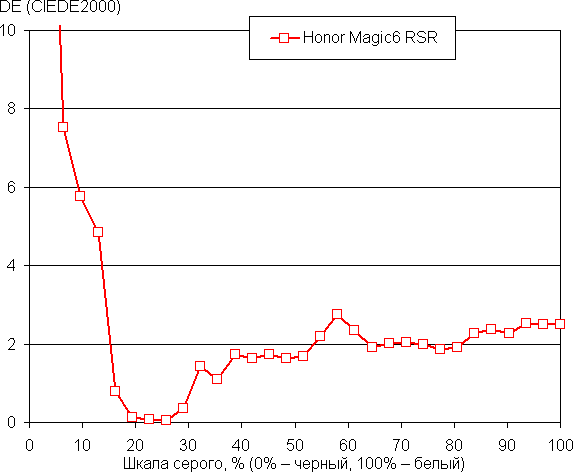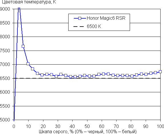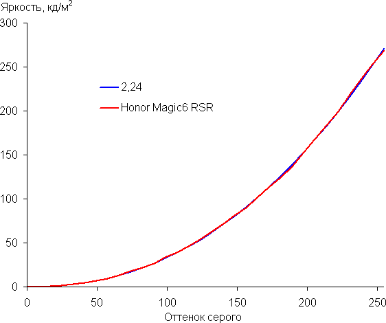 Напомним, что в случае OLED-экранов яркость фрагментов изображения динамично меняется в соответствии с характером выводимого изображения — чуть уменьшается для светлых в целом изображений. В итоге полученная зависимость яркости от оттенка (гамма-кривая), скорее всего, не соответствует гамма-кривой статичного изображения, так как измерения проводились при последовательном выводе оттенков серого почти на весь экран.