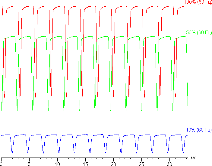 Видно, что скважность модуляции небольшая (да и фаза модуляции различается по площади экрана), в итоге видимого мерцания нет на любом уровне яркости. Однако при сильном снижении яркости (где-то ниже 15 кд/м²) в тесте на стробоскопический эффект наличие модуляции все же обнаруживается.