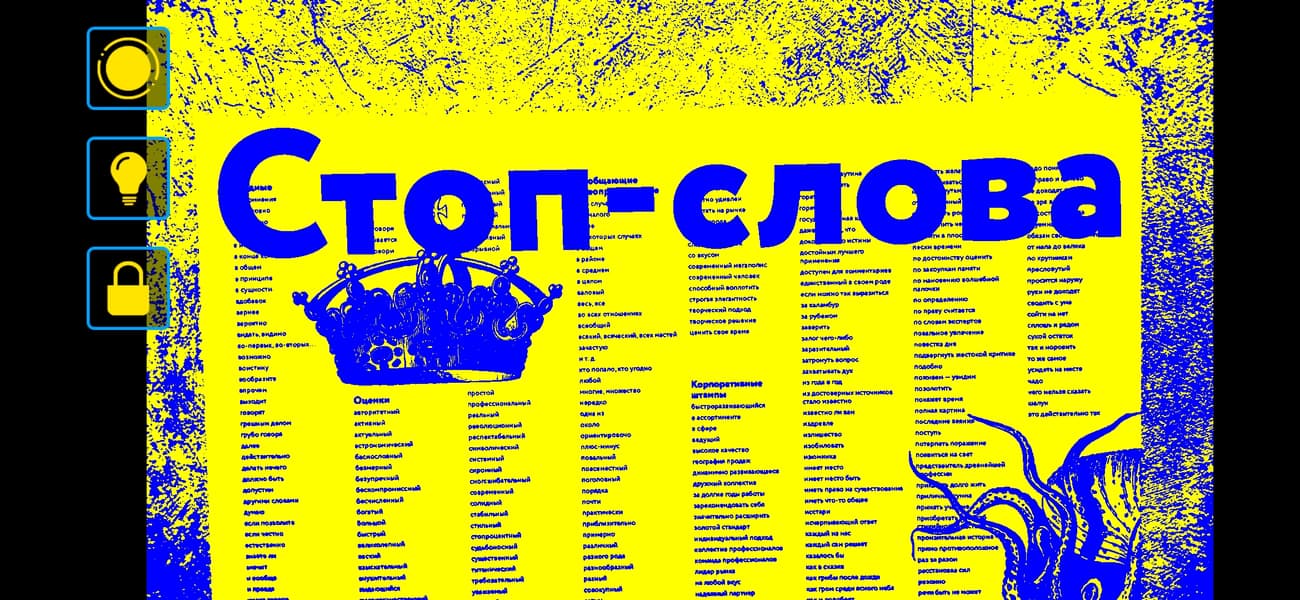 При открытии Vision в левом верхнем углу можно видеть три кнопки. Первая отвечает за изменение контрастности изображения в камере. Это нужно для того, чтобы было проще распознать и прочитать текст. Помимо простого повышения контрастности также доступны чёрно-белый, бело-черный и желто-синий фильтры. С помощью качельки регулировки громкости можно тут же увеличить текст в два или три раза.