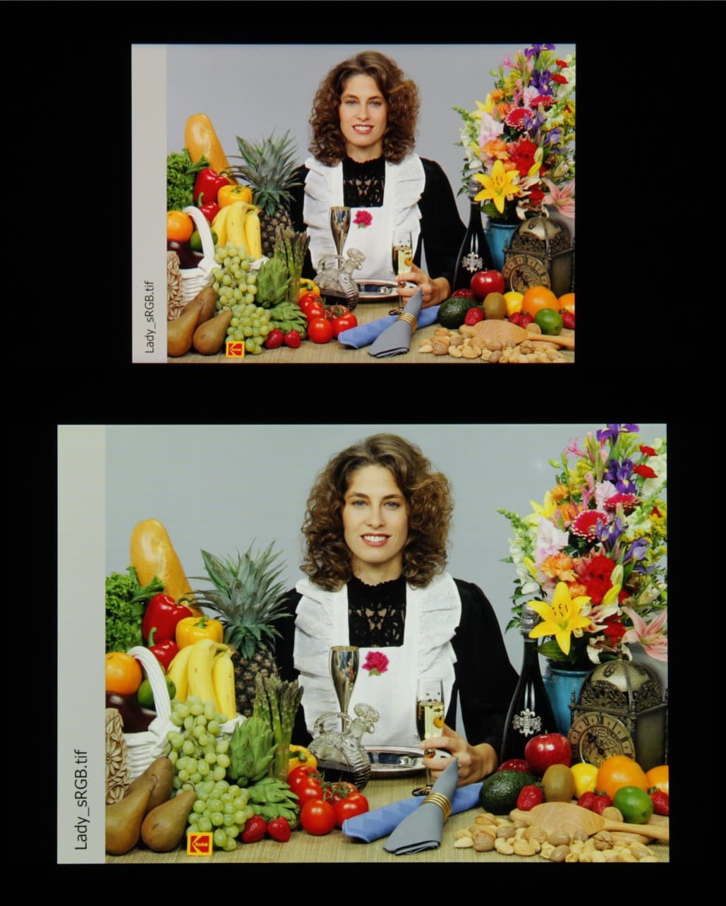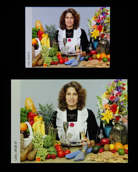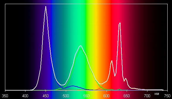 Спектры компонент достаточно хорошо разделены, что и обуславливает широкий цветовой охват. Для потребительского устройства широкий цветовой охват является недостатком, поскольку в итоге цвета изображений — рисунков, фотографий и фильмов, — ориентированных на пространство sRGB (а таких подавляющее большинство), имеют неестественную насыщенность. Особенно это заметно на узнаваемых оттенках, например на оттенках кожи. Результат приведен на фотографиях выше.