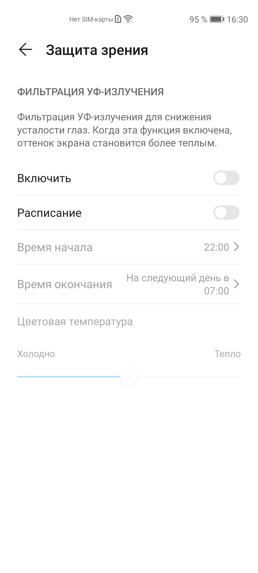 Маркетологи постарались запугать пользователя, чтобы показать степень заботы производителя. Разумеется, нет никакого вредоносного УФ-излучения (см. спектр выше), и нет никакой усталости глаз, обусловленной именно синим светом. В принципе, яркий свет может приводить к нарушению суточного (циркадного) ритма, но все решается подстройкой яркости до комфортного уровня, а искажать цветовой баланс, уменьшая вклад синего, нет абсолютно никакого смысла.
