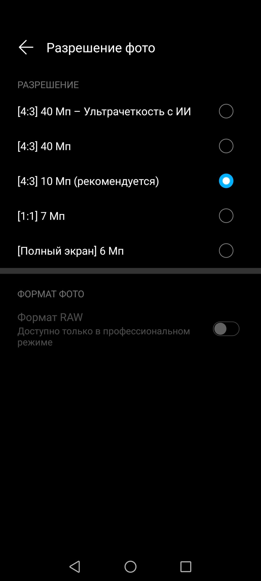 Единственный неудобный момент — реализация переключения между максимальным разрешением и разрешением по умолчанию (10 Мп). Только в режиме съемки 10 Мп появляются все возможности для зумирования, переключения объективов и пр. У смартфонов Xiaomi, например, включение максимального разрешения располагается прямо тут же, на колесе прокрутки, перед глазами — это куда удобнее. У большинства других смартфонов с такой возможностью разрешение тоже переключается на лету, и лишь у Huawei/Honor за этим приходится лезть в настройки.