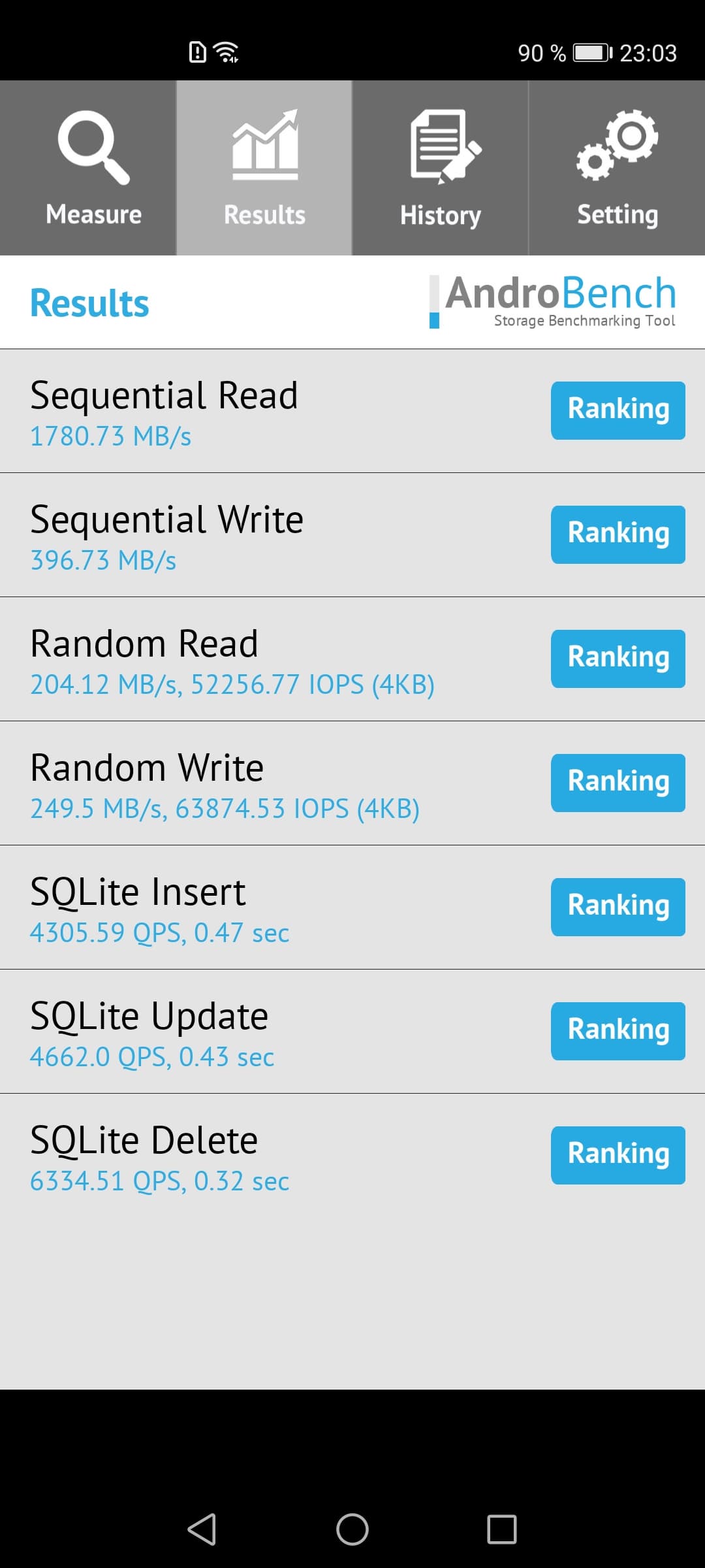 Результаты теста AndroBench на скорость работы с памятью: