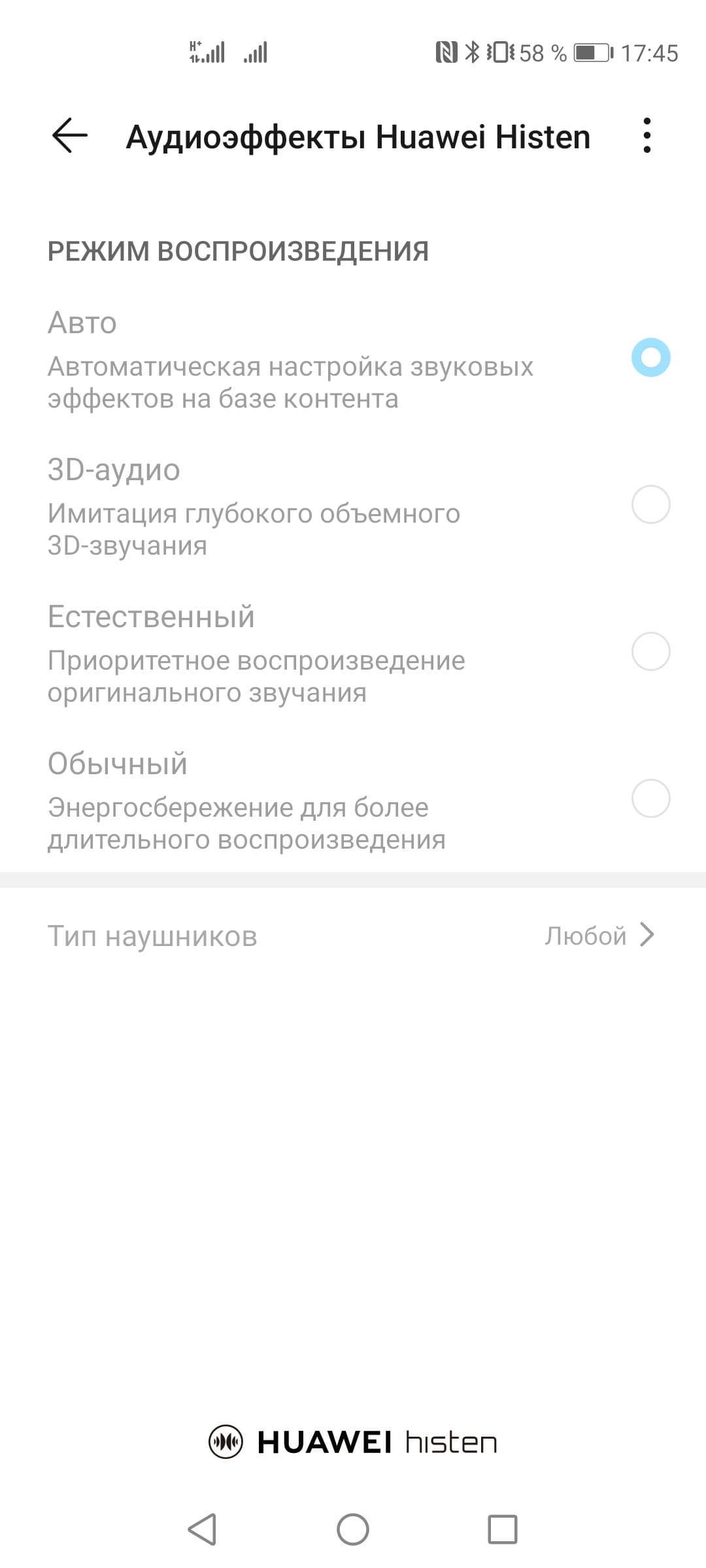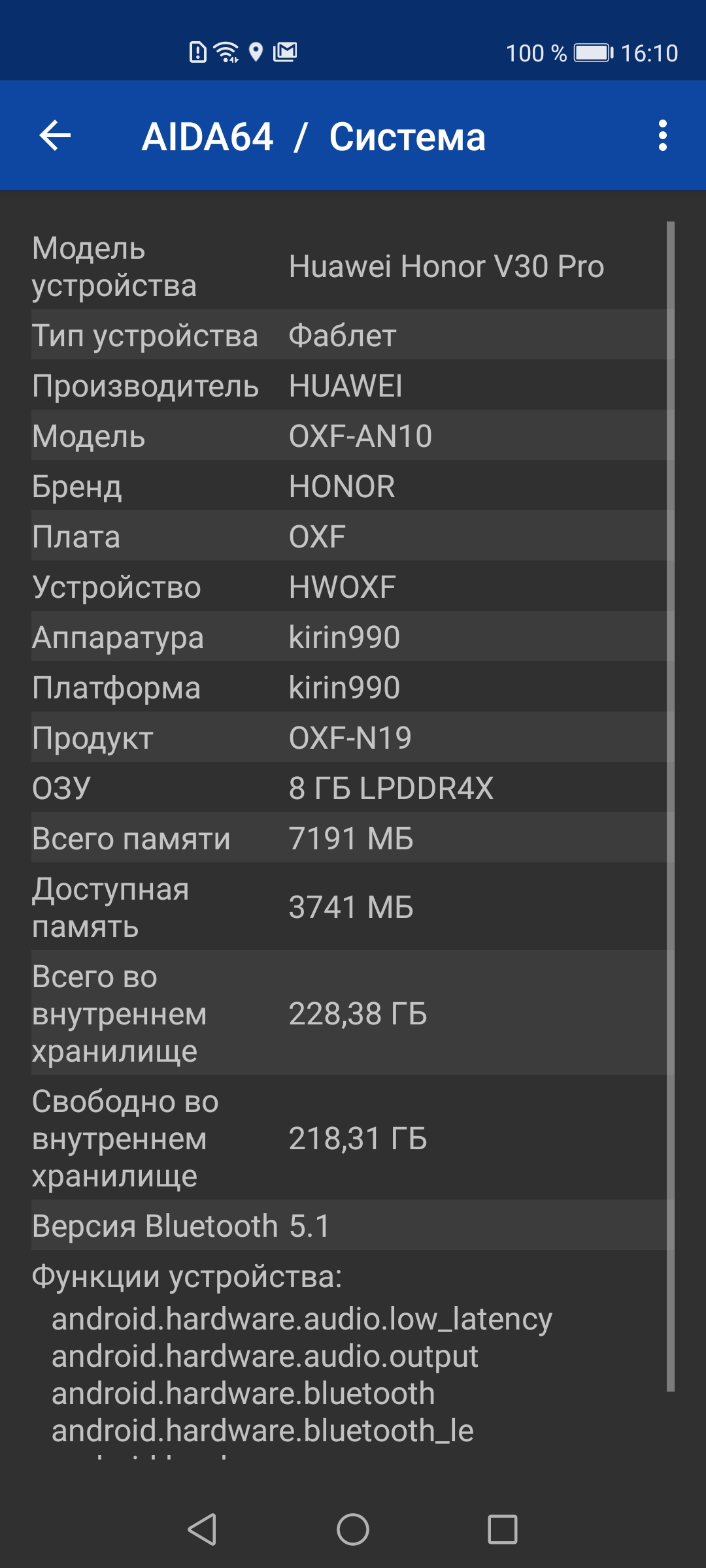 В смартфоне Honor View 30 Pro не установлены стереодинамики, но и единственный громкоговоритель выдает весьма достойный звук — чистый, яркий, с большим запасом громкости. Все очень хорошо, жаль только, что не сохранили 3,5-миллиметровый аудиовыход на наушники. Для наушников нет поддержки Dolby Atmos, поскольку установлена собственная система настроек Histen, но в целом громкость и качество звука в наушниках достойные. Для беспроводных ушных телефонов нет поддержки кодеков aptX.