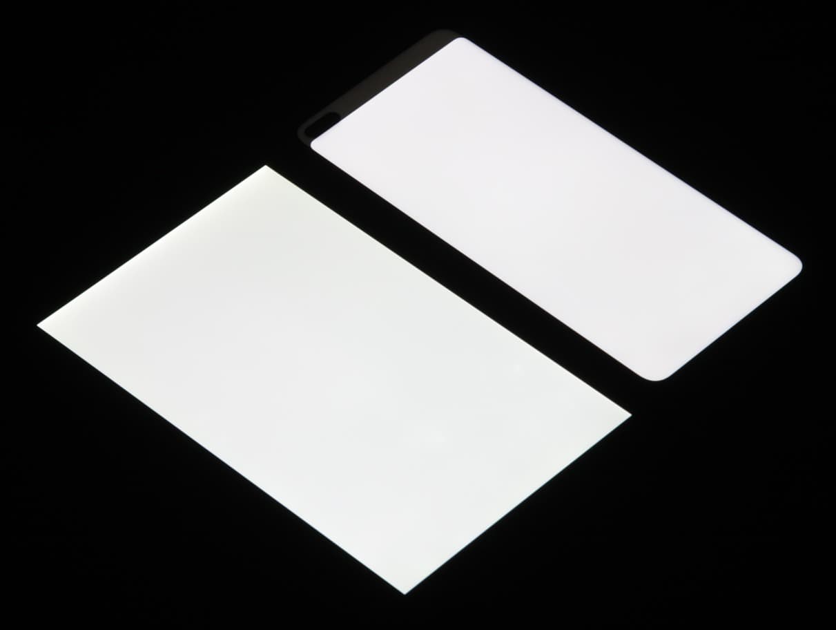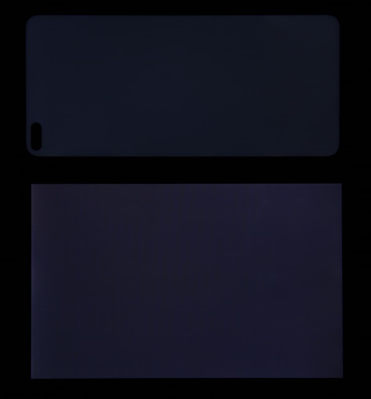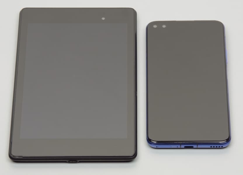 Лицевая поверхность экрана выполнена в виде стеклянной пластины с зеркально-гладкой поверхностью, устойчивой к появлению царапин. Судя по отражению объектов, антибликовые свойства экрана лучше, чем у экрана Google Nexus 7 (2013) (далее просто Nexus 7). Для наглядности приведем фотографию, на которой в выключенных экранах отражается белая поверхность (слева — Nexus 7, справа — Honor View 30 Pro, далее их можно различать по размеру):