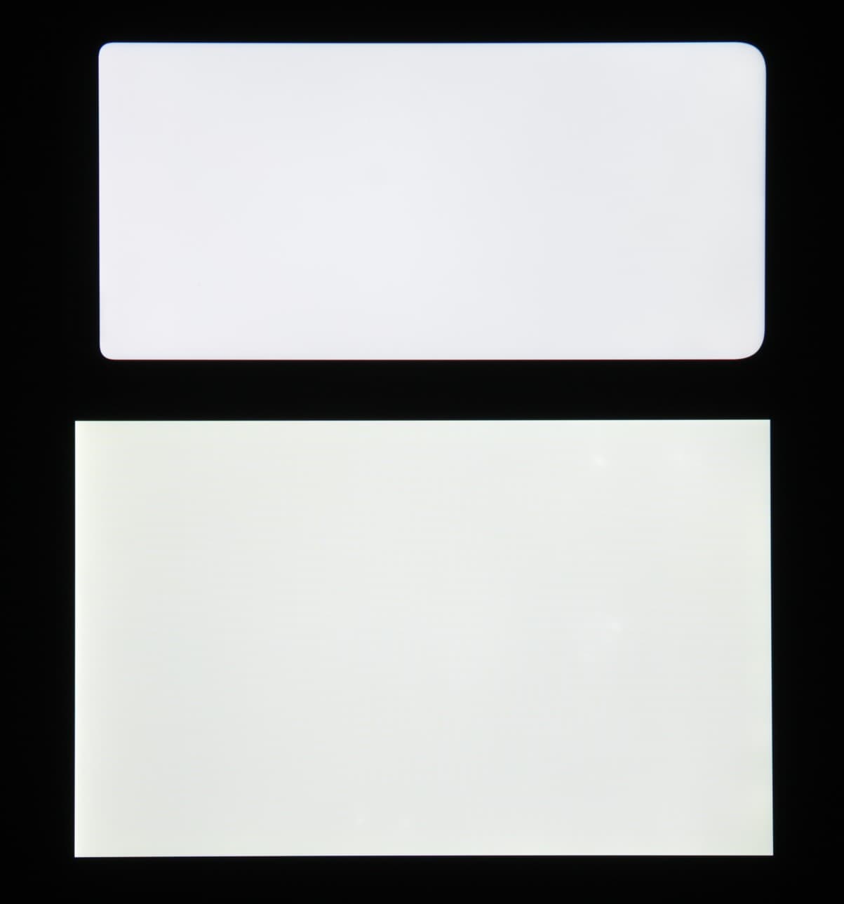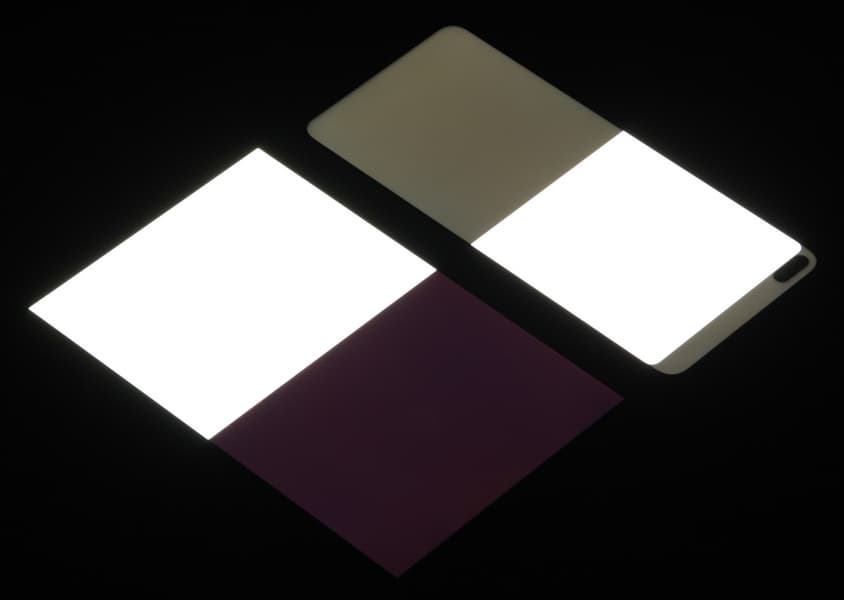 Яркость под углом у экранов уменьшилась (как минимум в 5 раз, исходя из разницы в выдержке), и уменьшилась примерно одинаково. Черное поле при отклонении по диагонали высветляется сильно, но остается условно нейтрально-серым (так видно глазами). Фотографии ниже это демонстрируют (яркость белых участков в перпендикулярном плоскости экранов направлении одинаковая!):